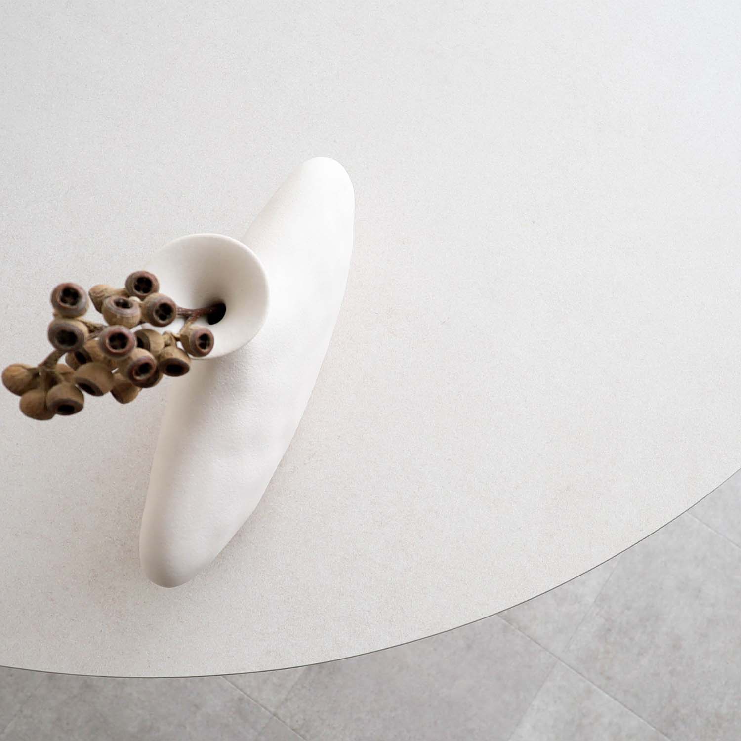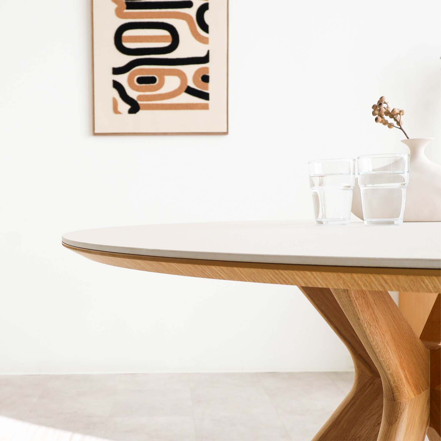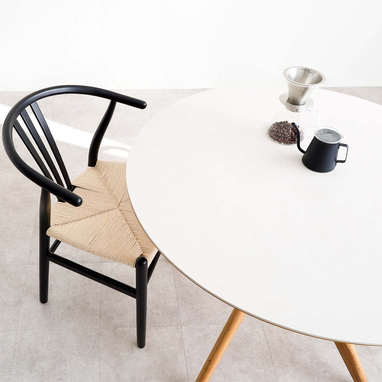 丸型の天板は圧迫感が少なく、どの角度から見ても美しいフォルム。家族の顔が自然と向き合う距離感で、心地よい団らんの場をつくります。