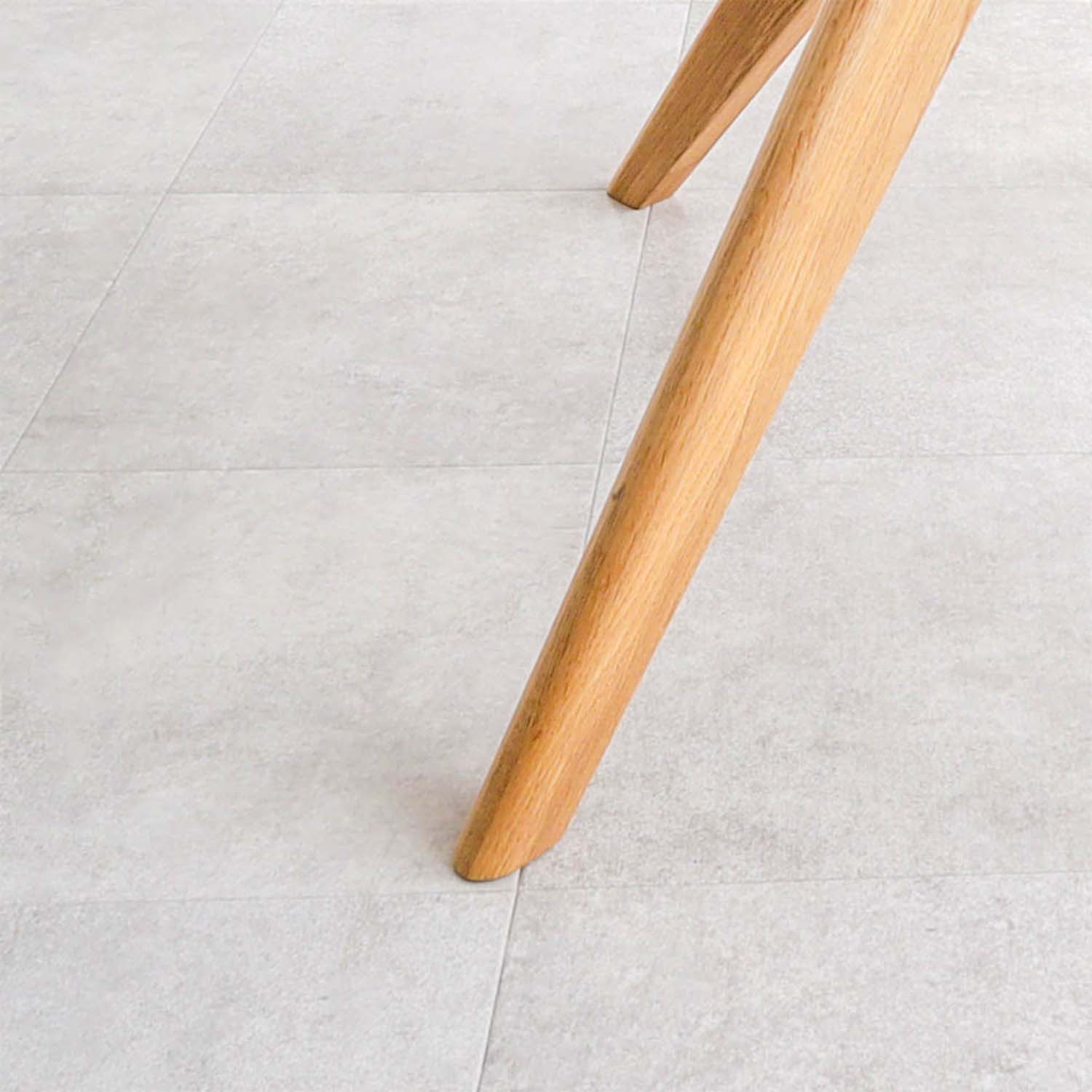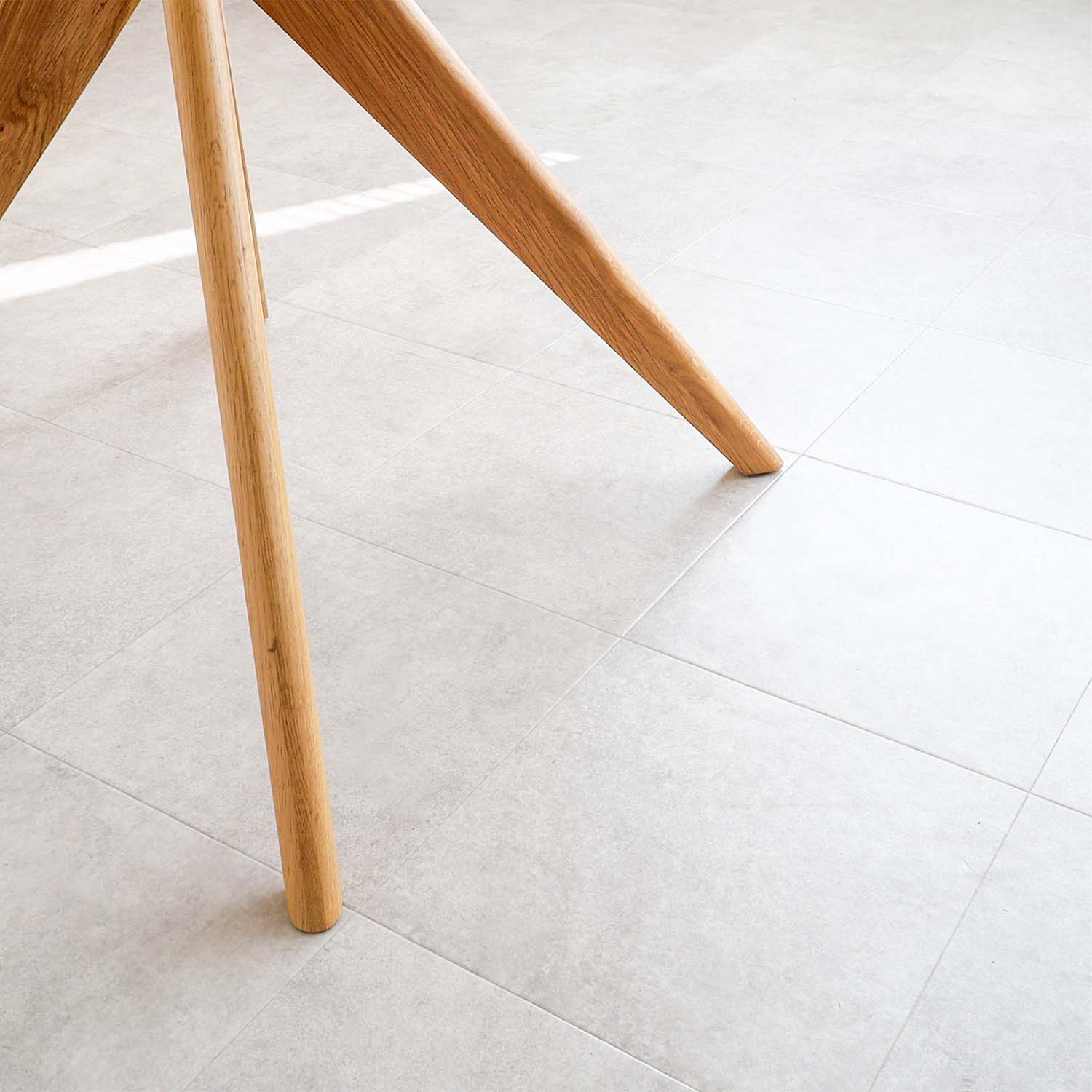 脚部はオーク無垢材を贅沢に使用。放射状に広がる独自のデザインが視線を惹きつけ、天然木ならではの風合いがやさしい温もりを与えます。