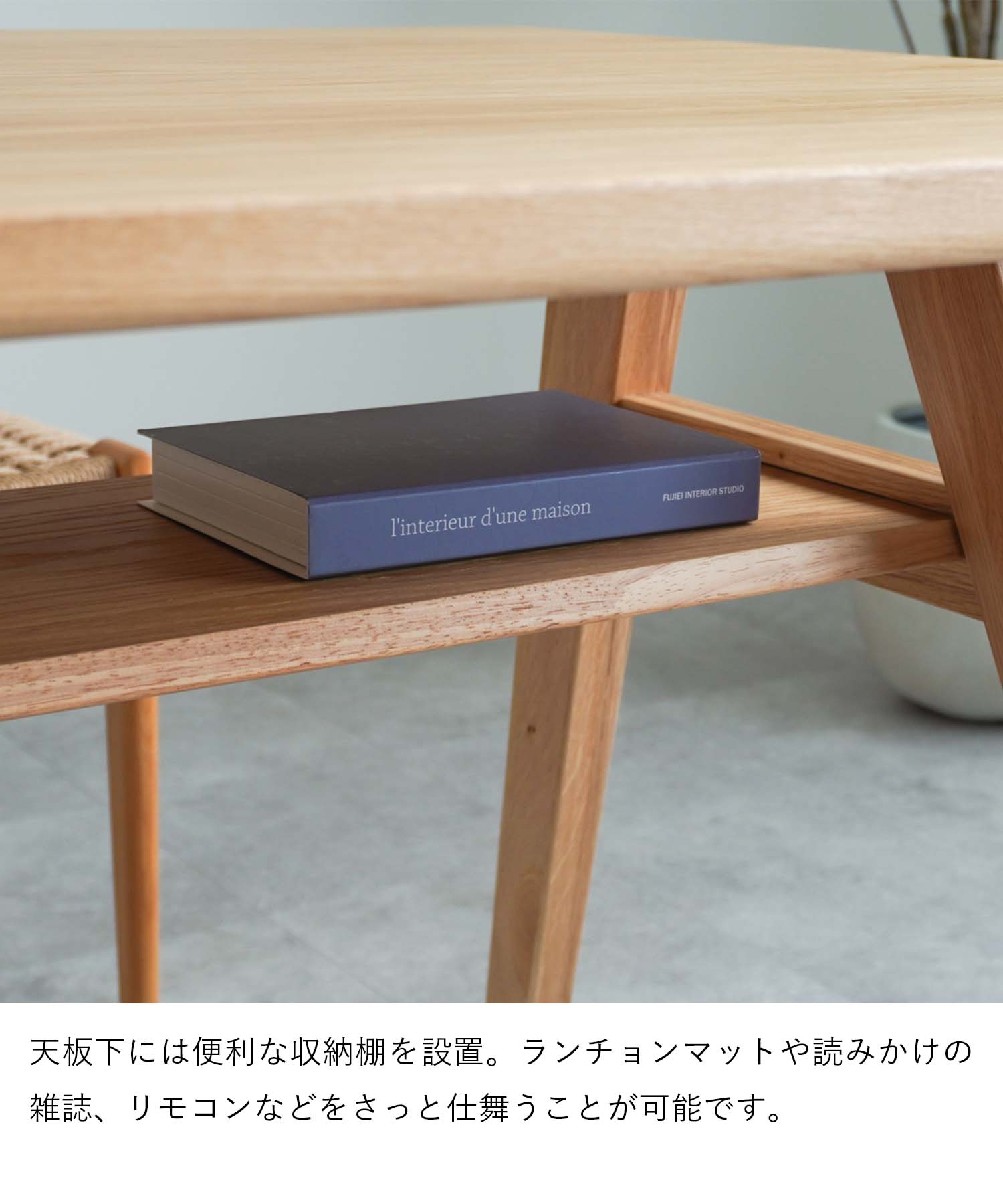 天板下には便利な収納棚を設置。ランチョンマットや読みかけの雑誌、リモコンなどをさっと仕舞うことが可能。
