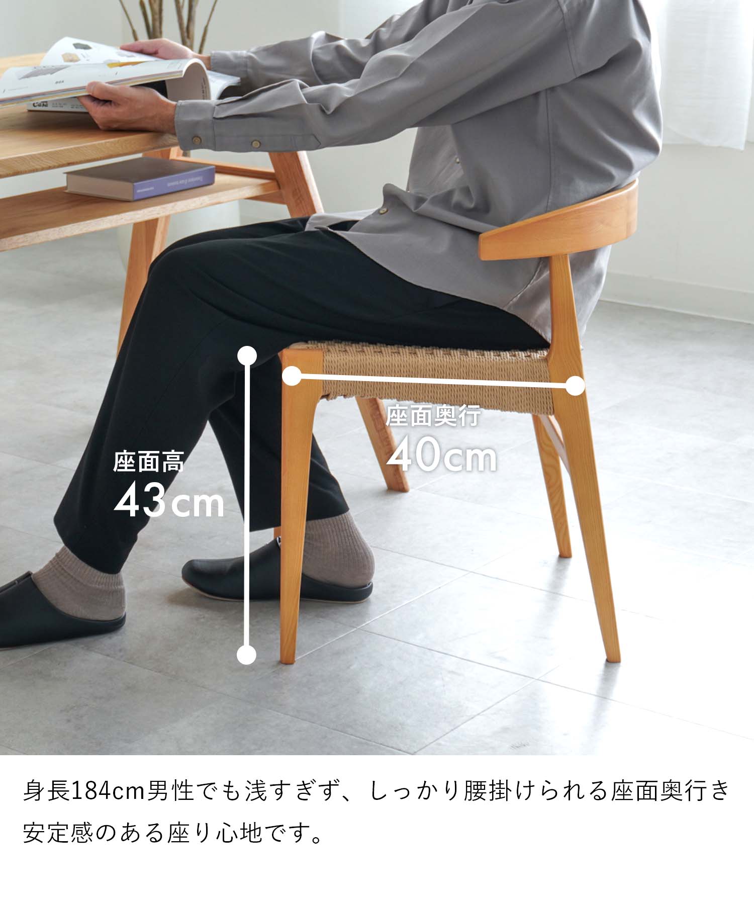 身長184cm男性でも浅すぎず、しっかり腰掛けられる座面奥行き。安定感のある座り心地です。