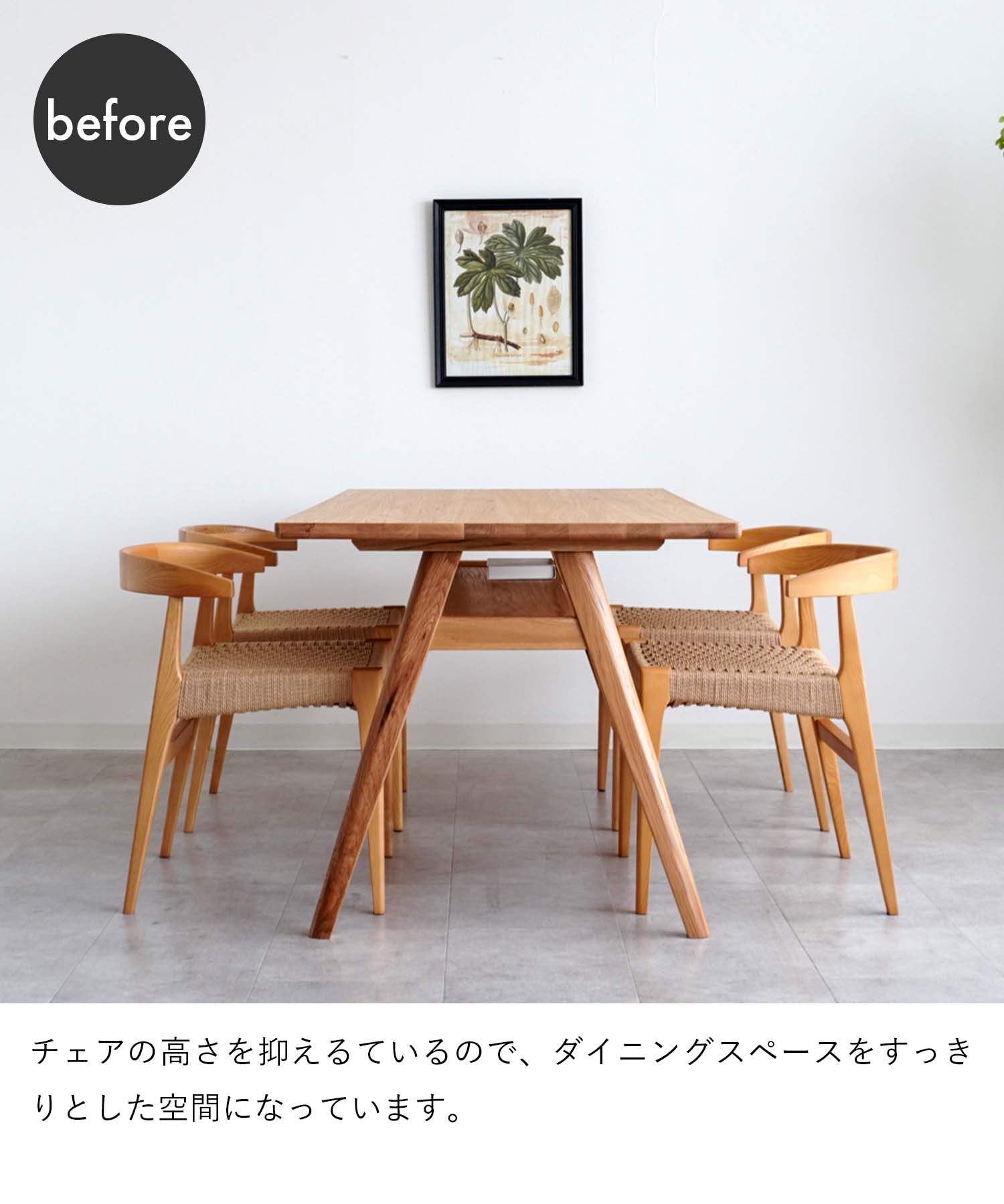 チェアの高さを抑えるているので、ダイニングスペースをすっきりとした空間になっています。