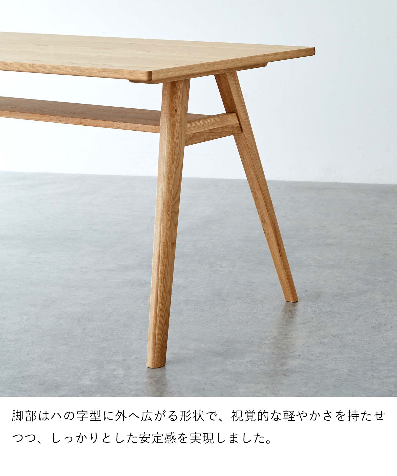 脚部はハの字型に外へ広がる形状で、視覚的な軽やかさを持たせつつ、しっかりとした安定感を実現。床が見えるデザインが圧迫感を軽減。