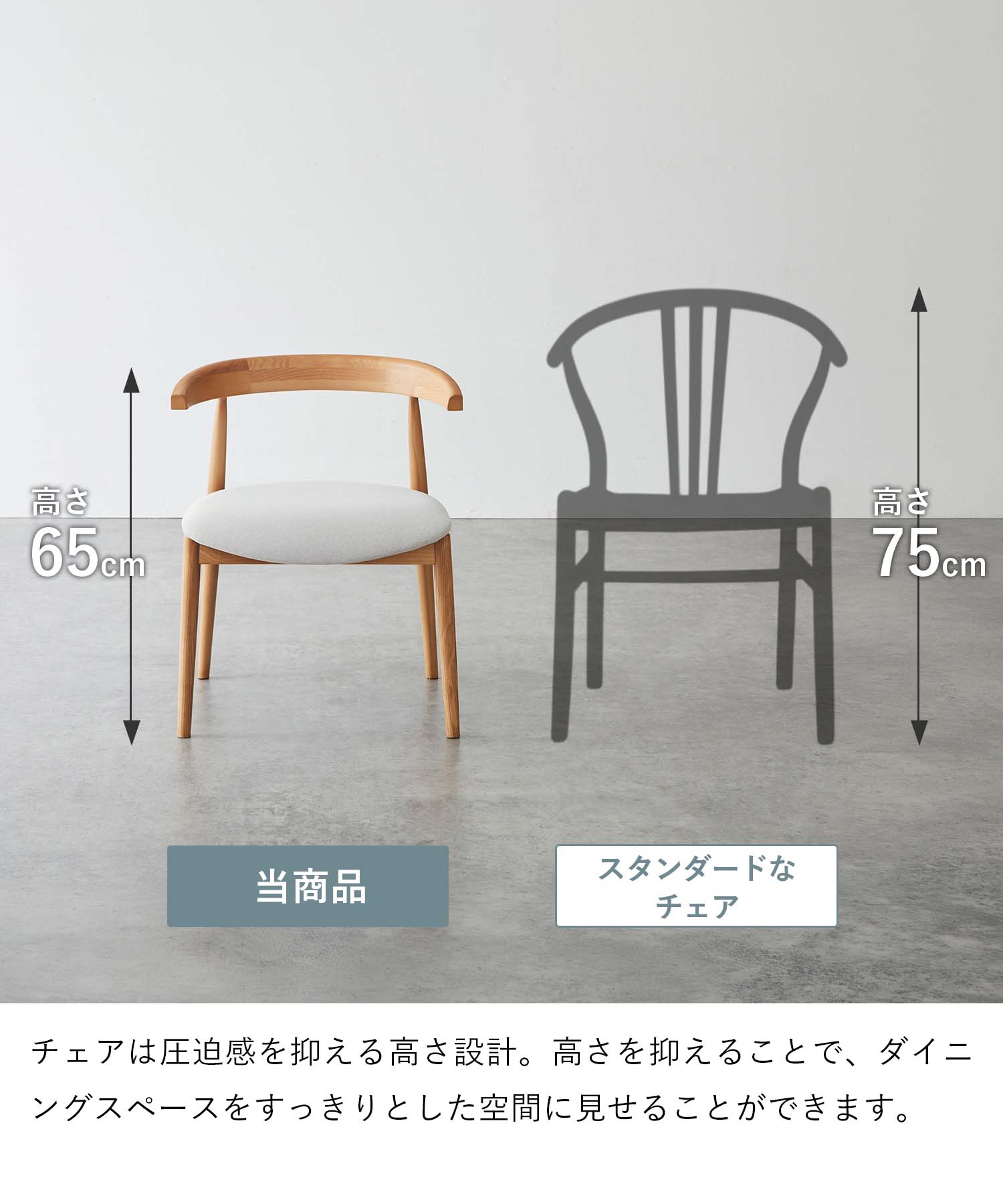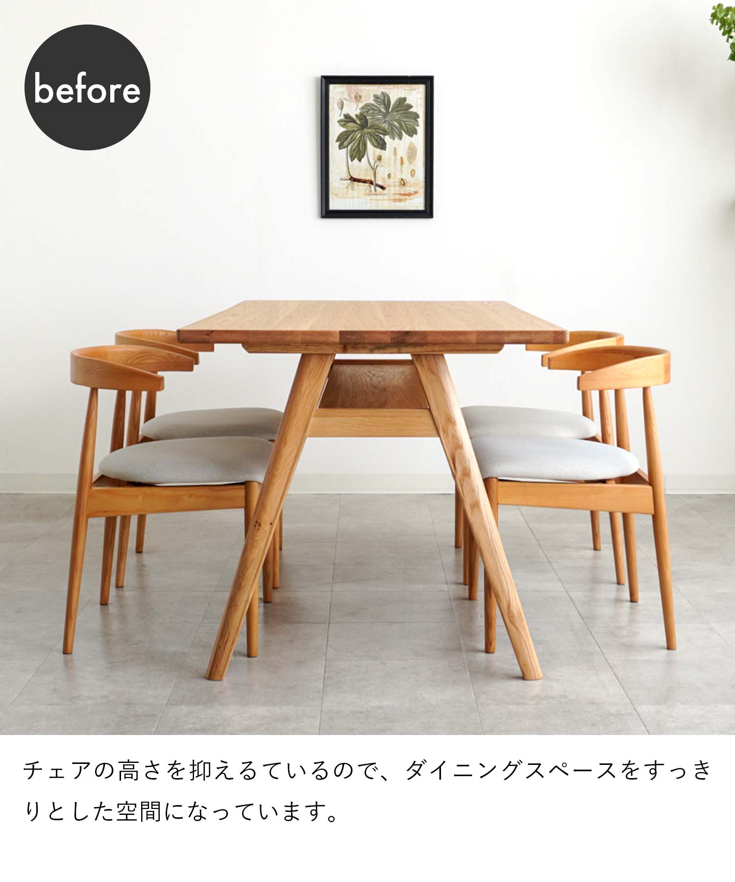 チェアの高さを抑えることで、ダイニングスペースをすっきりとした空間に見せることができます。