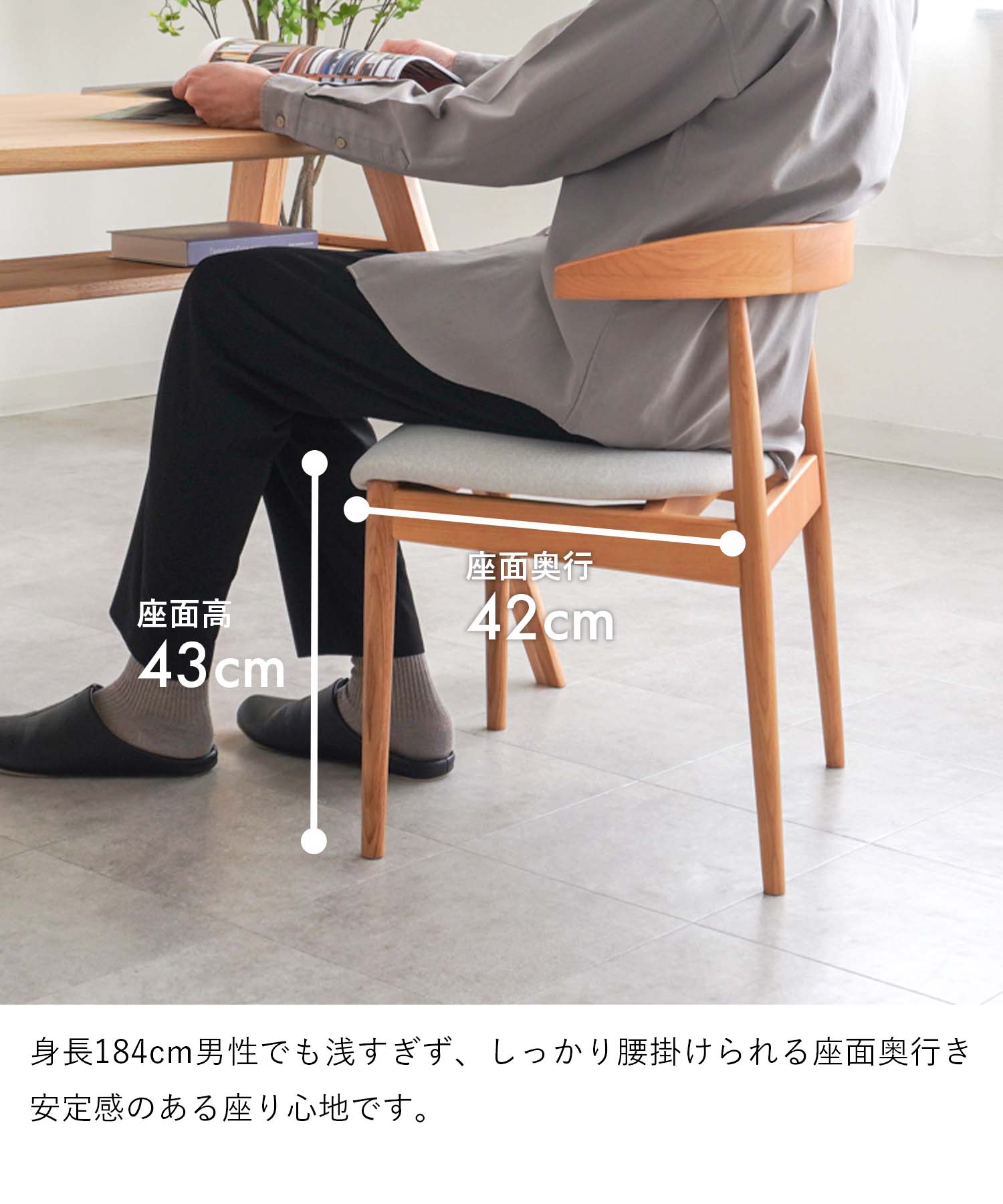 身長184cm男性でも浅すぎず、しっかり腰掛けられる座面奥行き。安定感のある座り心地です。