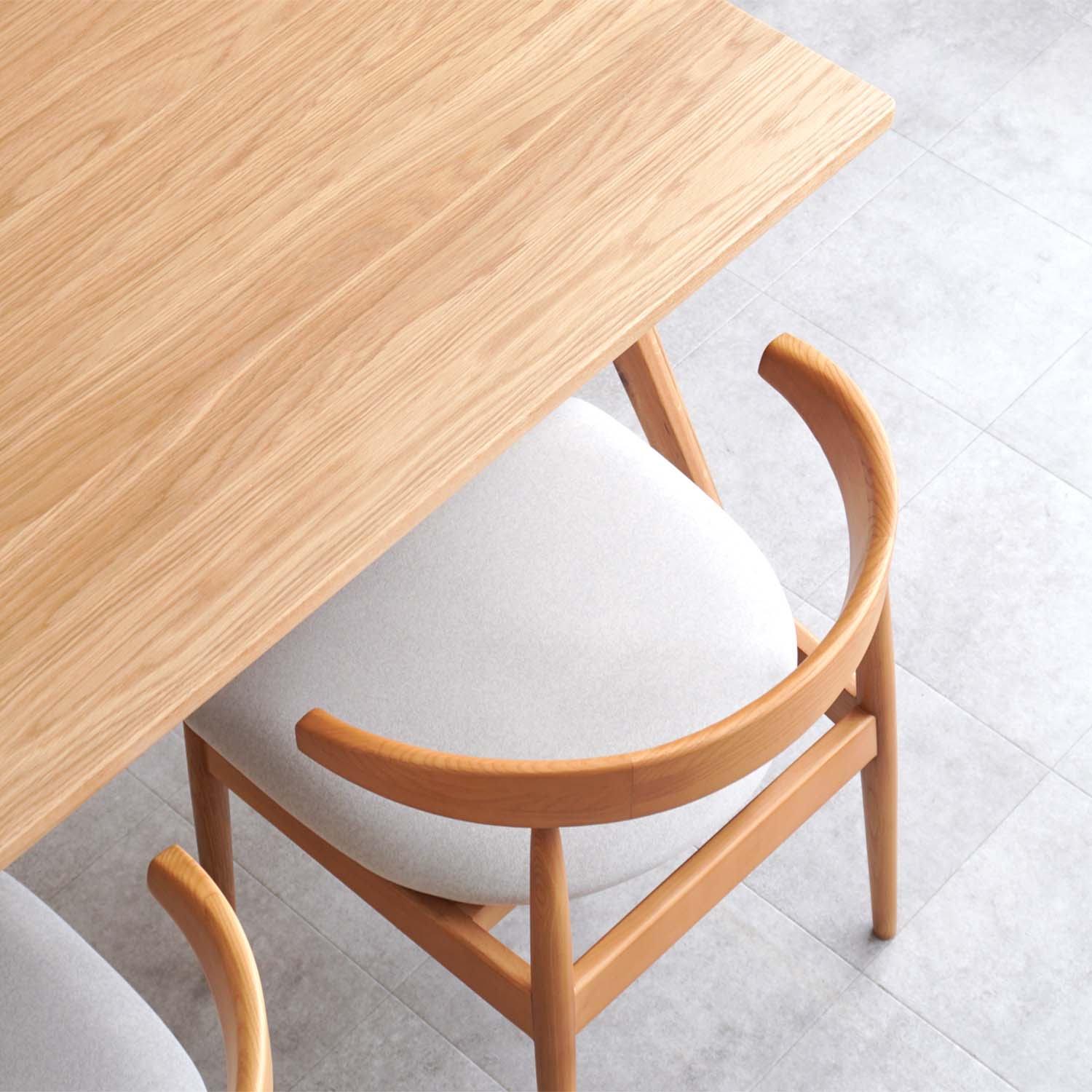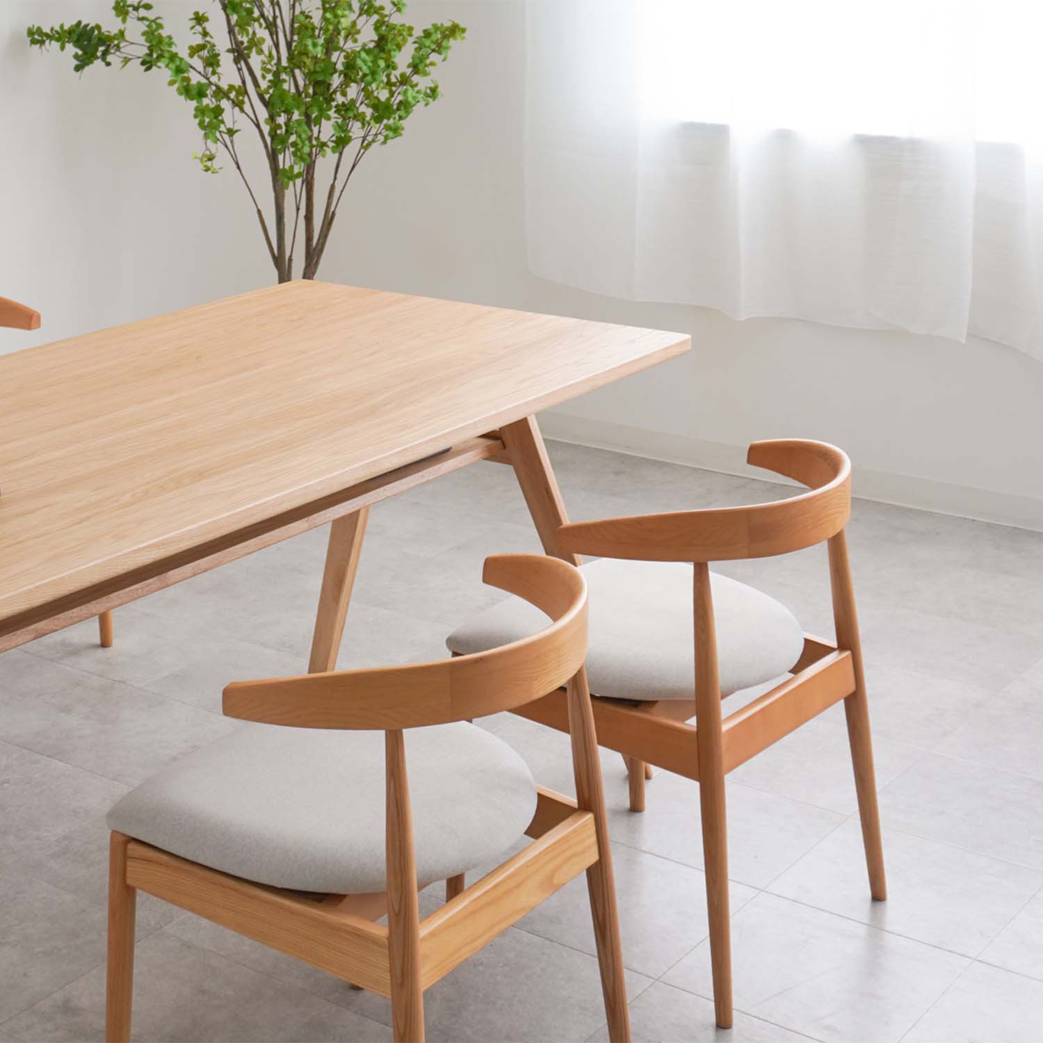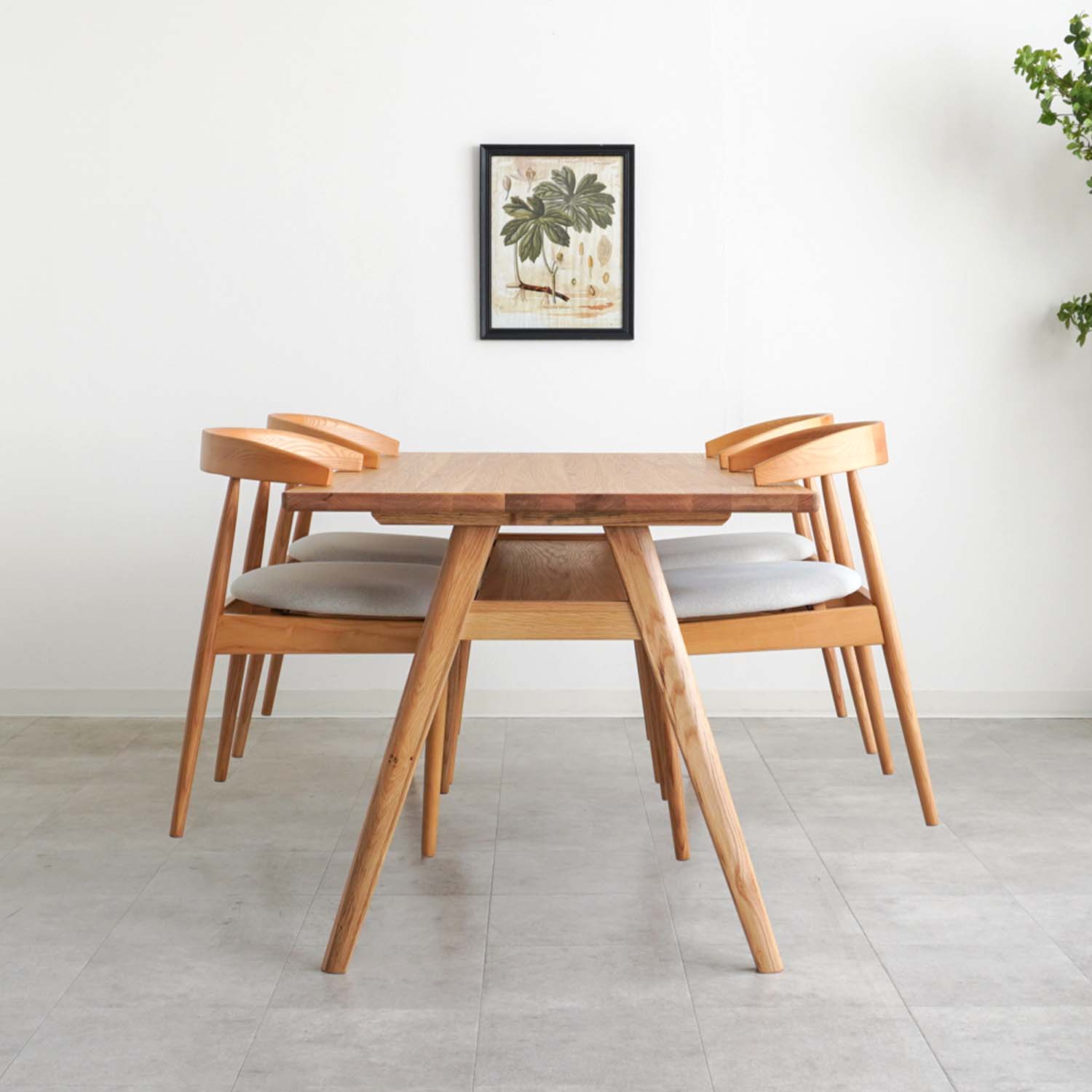 オークの美しい木目が際立つ幅150cmのダイニングテーブルと、やさしい座り心地のアームチェアを組み合わせた、ナチュラルな空間に調和するセットです。