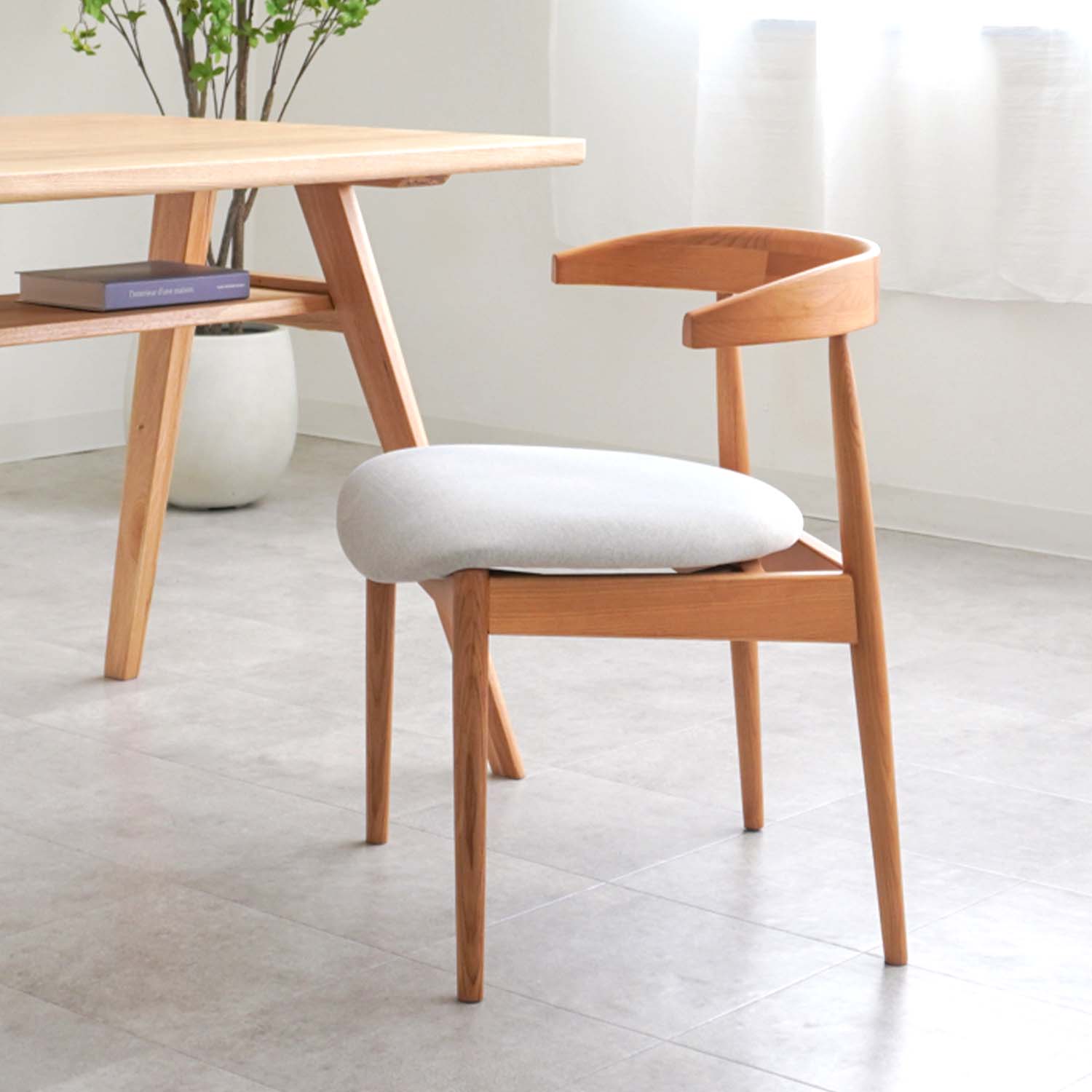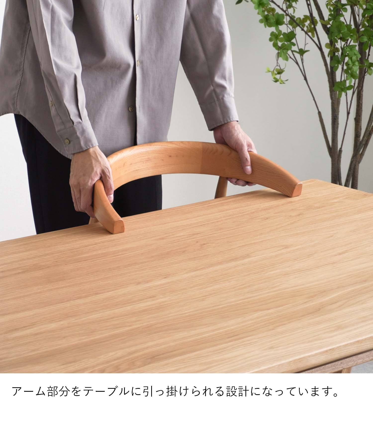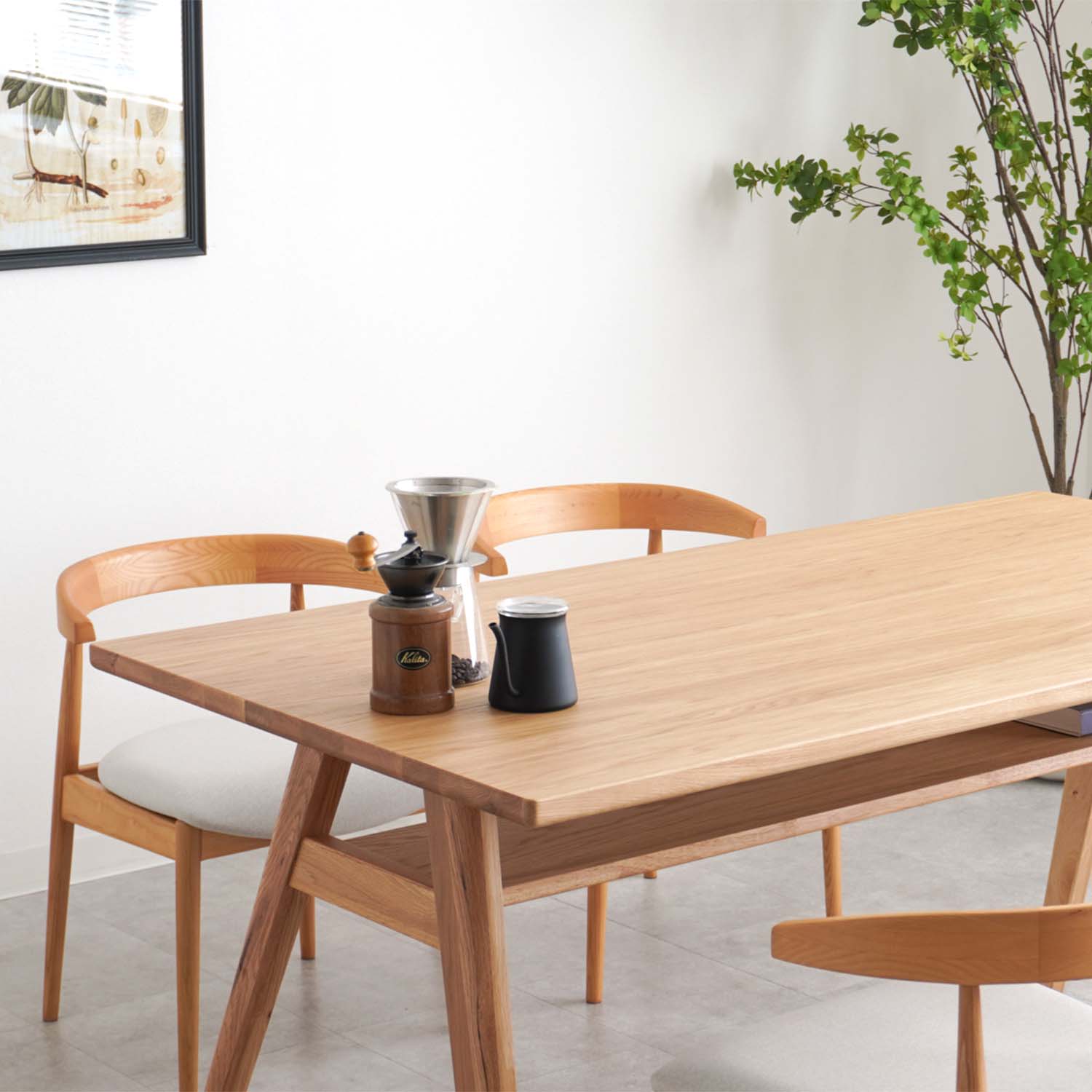 オークの美しい木目が際立つ幅150cmのダイニングテーブルと、やさしい座り心地のアームチェアを組み合わせた、ナチュラルな空間に調和するセットです。