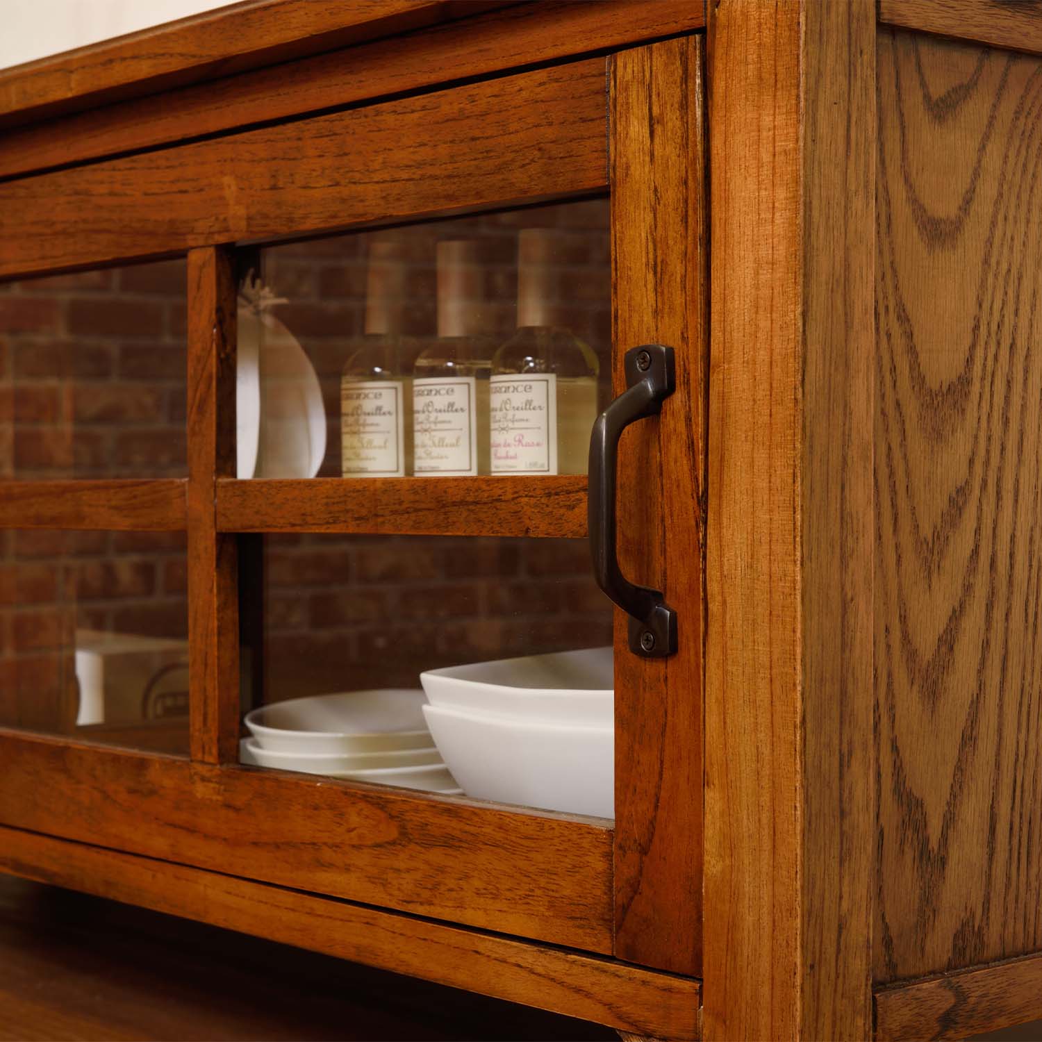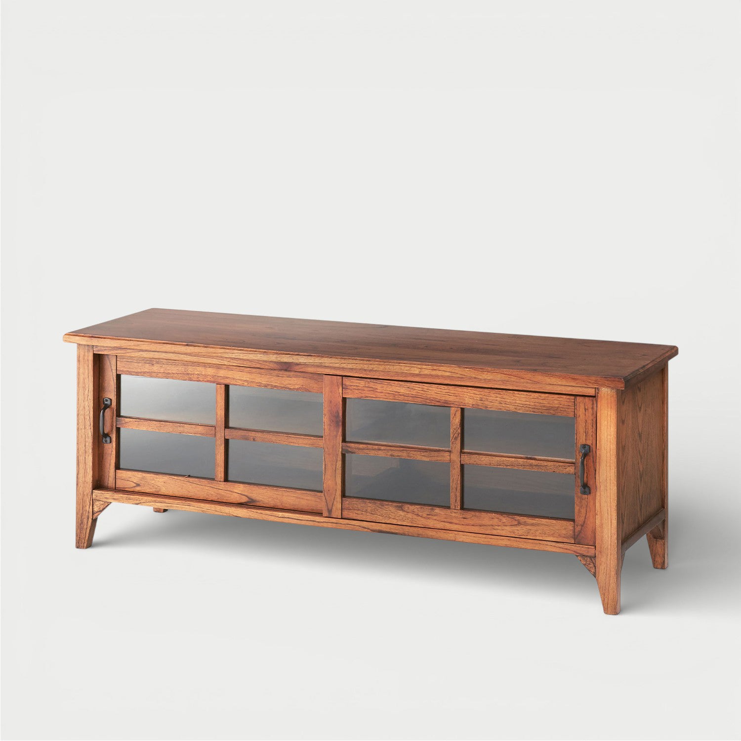 42V型テレビまで対応するサイズ感で、テレビ台としてはもちろん、収納棚やキャビネットとしても活躍。ガラス扉と引き戸を組み合わせたデザインで、見せる収納と隠す収納をバランスよく楽しめる一台です。