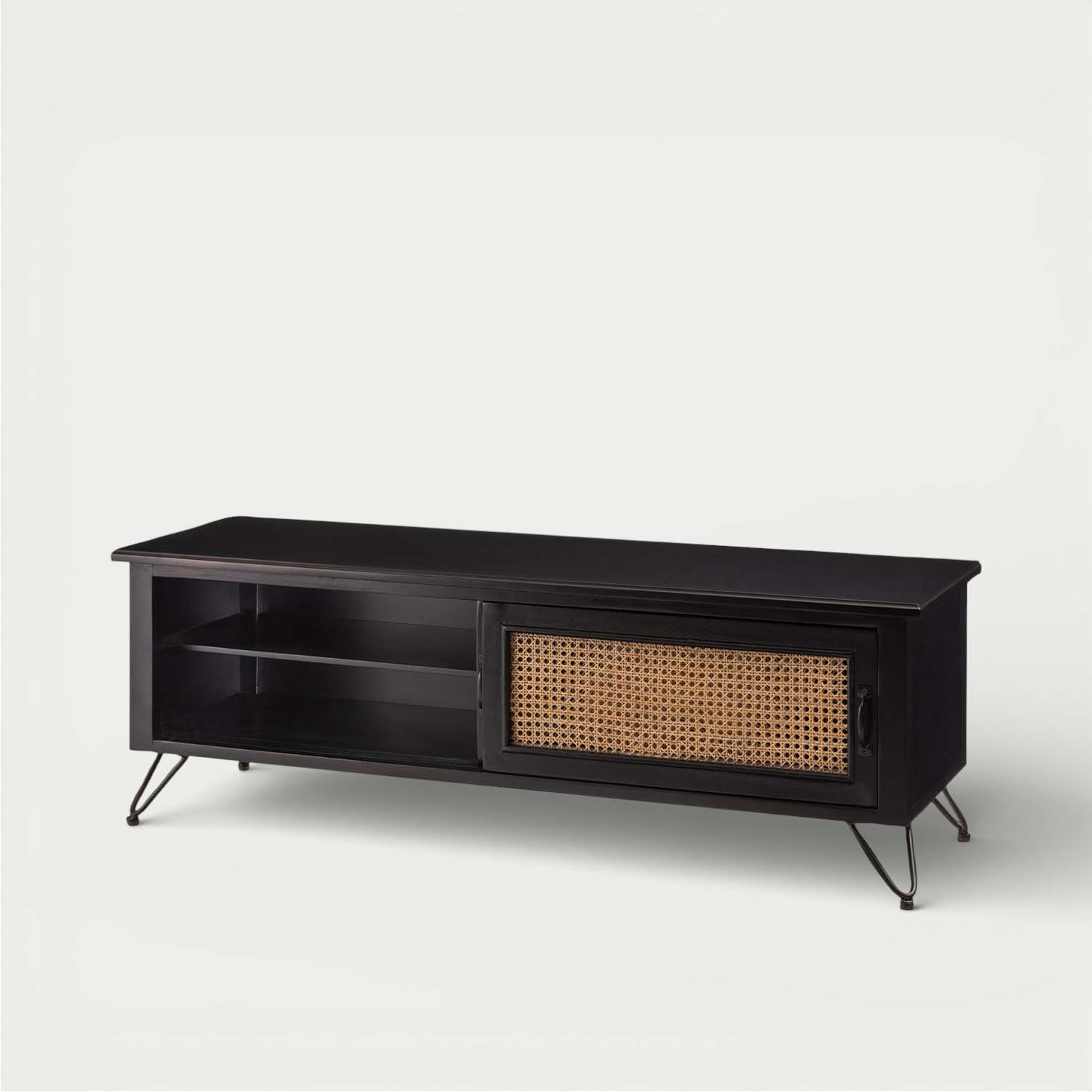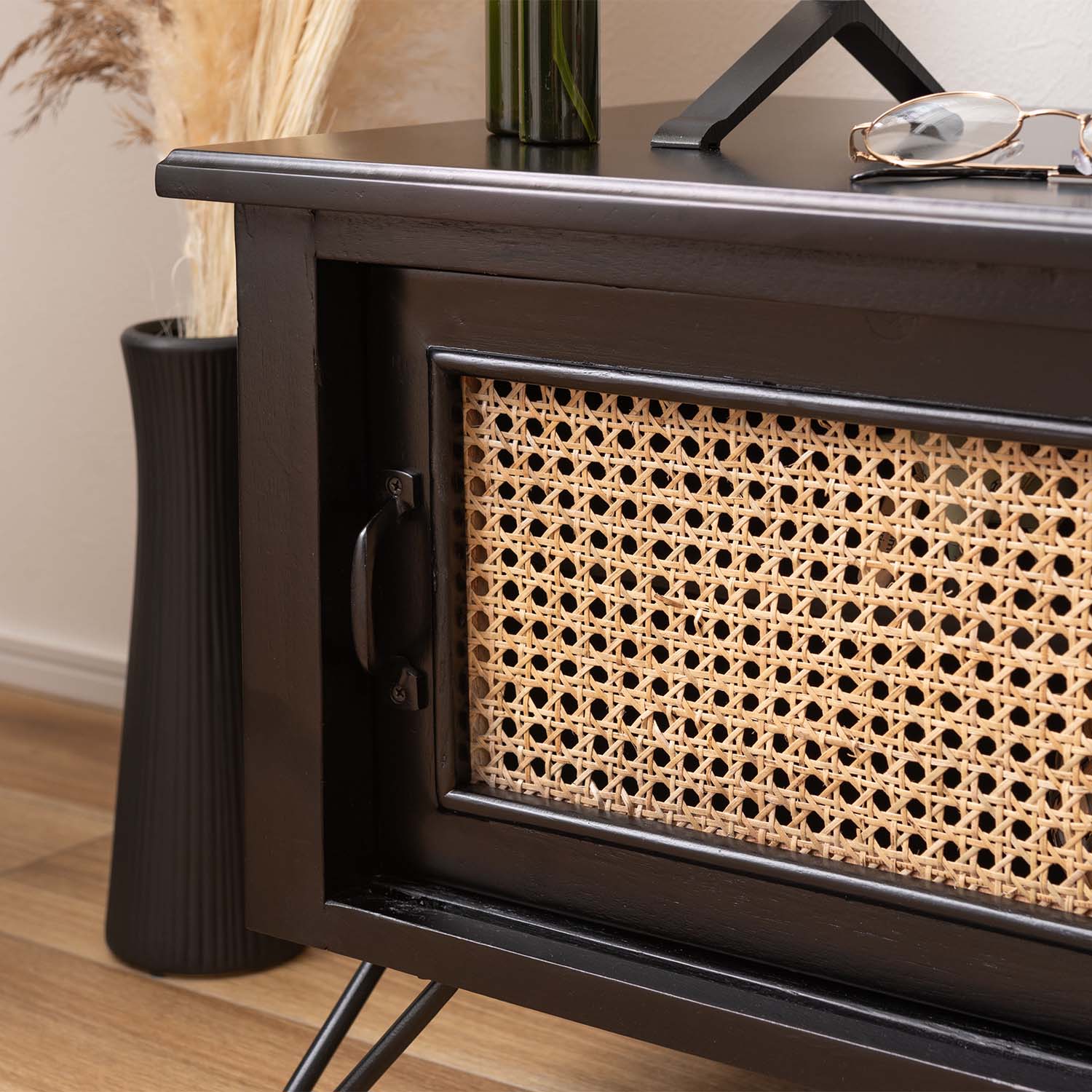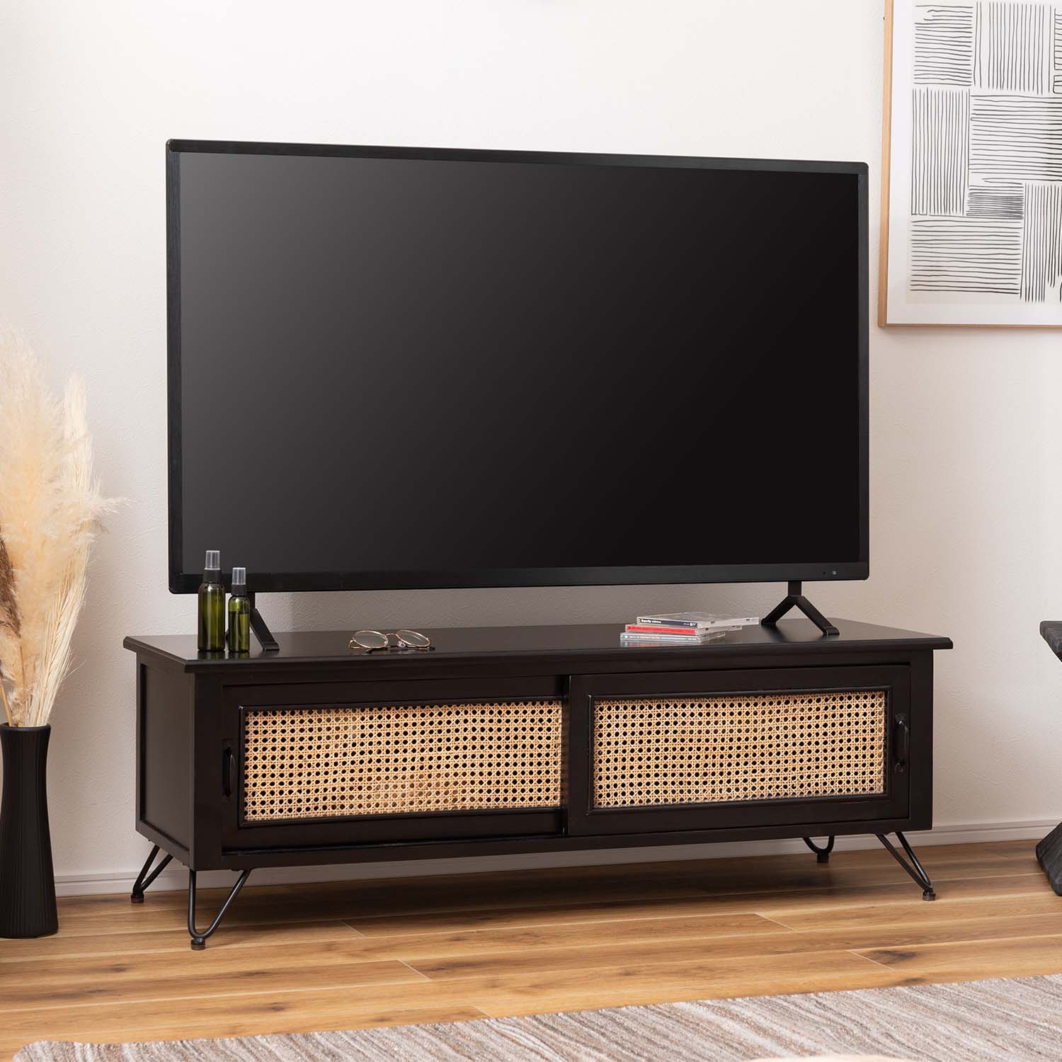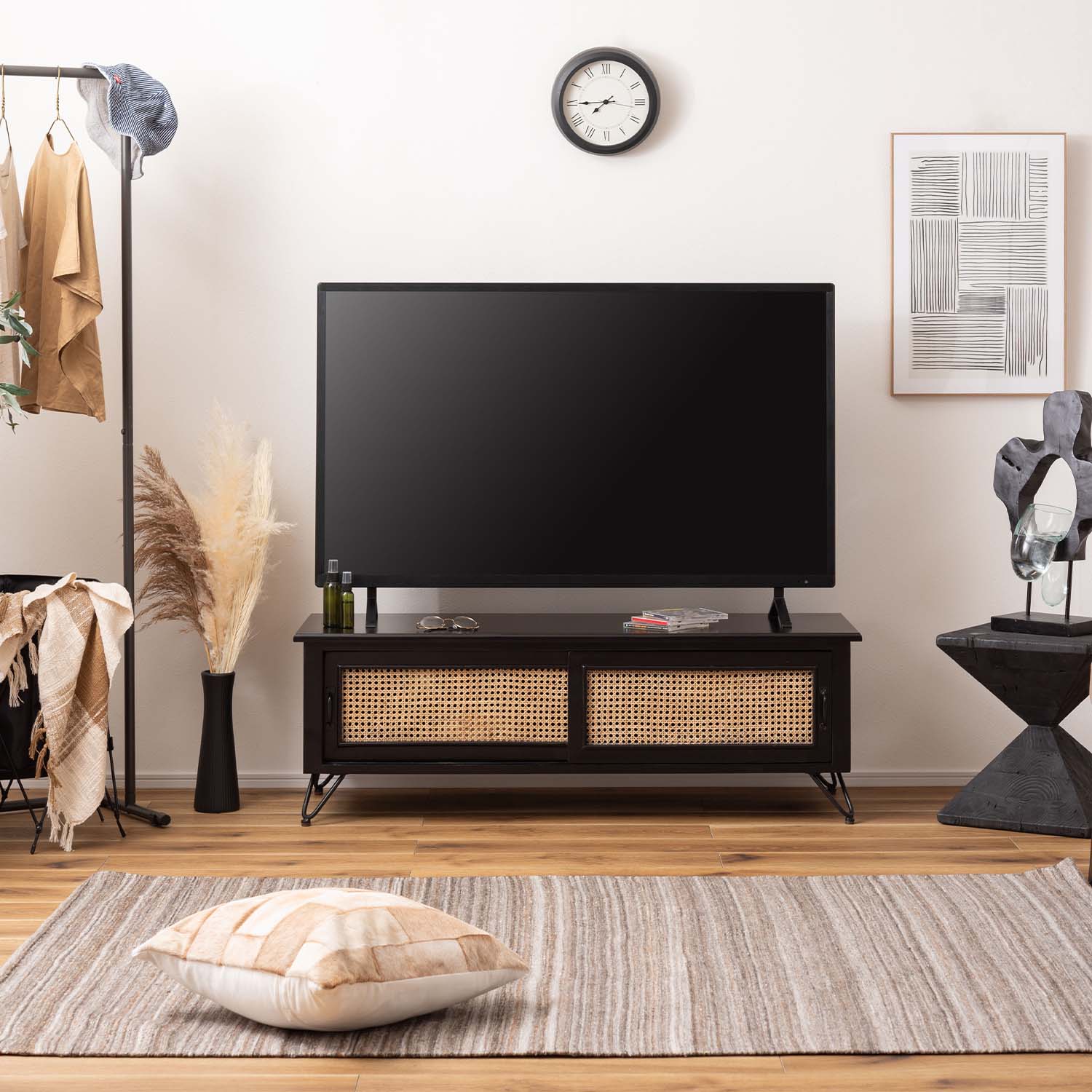マットブラックの木部と天然ラタンを組み合わせ、重厚感と抜け感を両立した洗練されたテレビボードです。