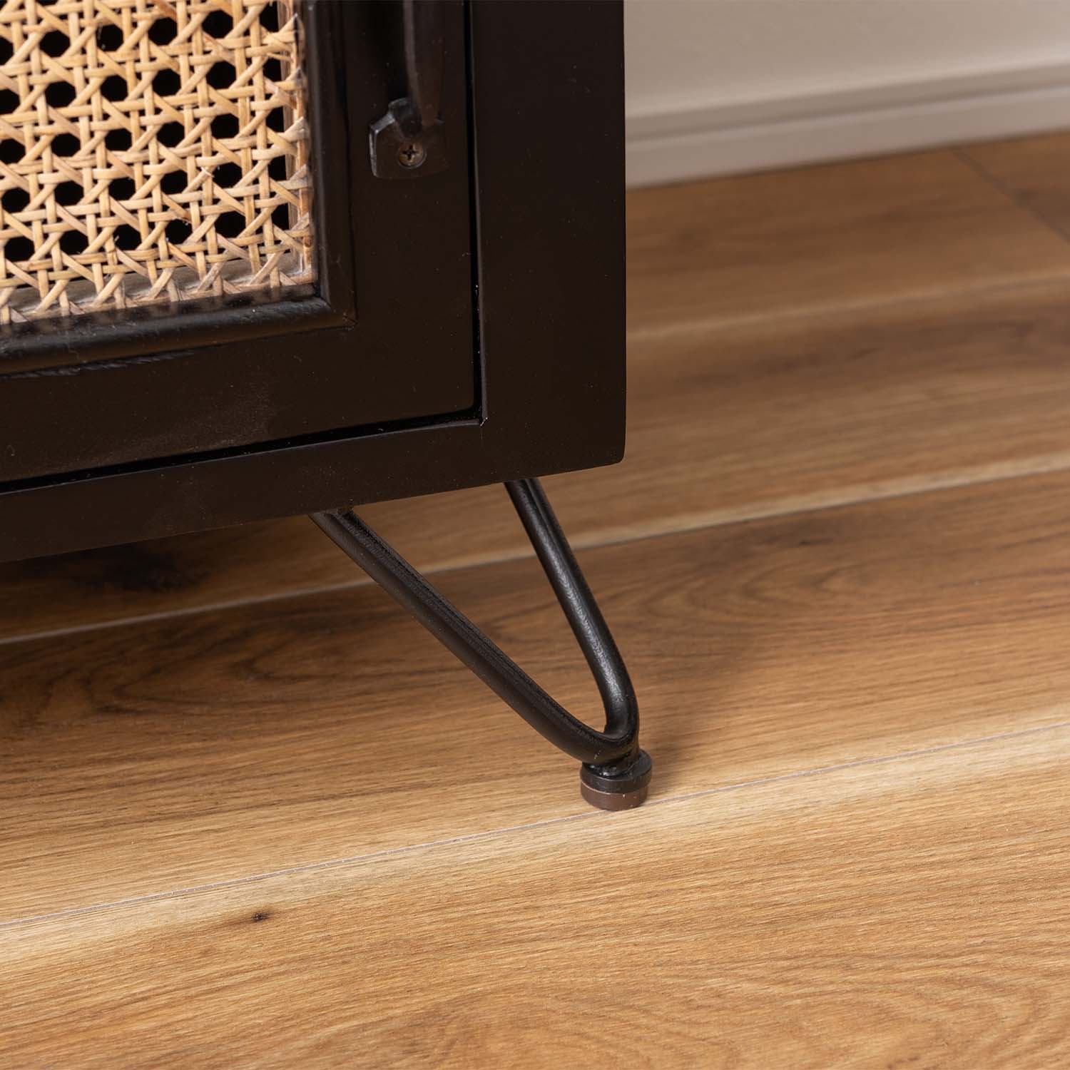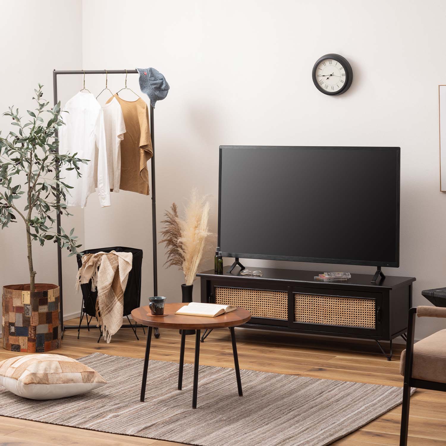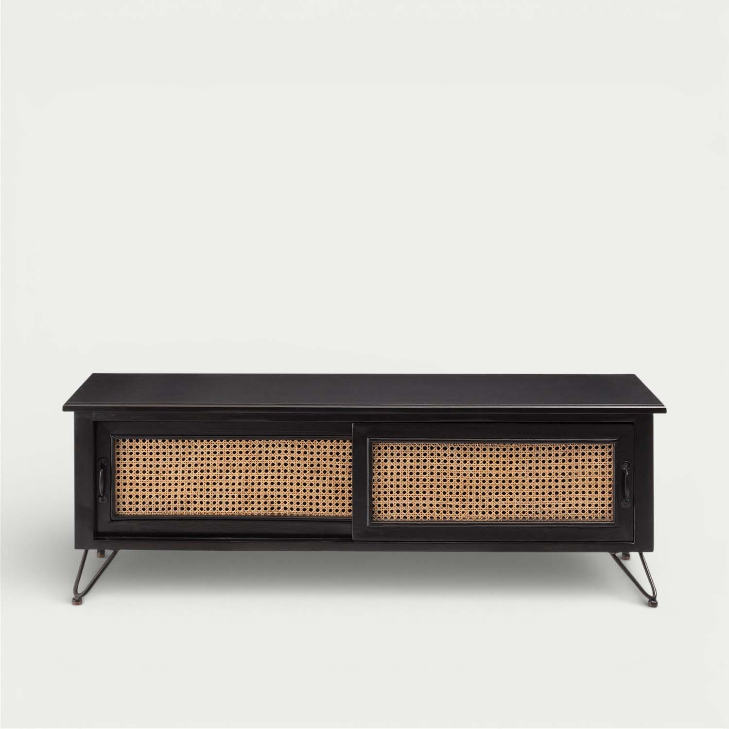 マットブラックの木部と天然ラタンを組み合わせ、重厚感と抜け感を両立した洗練されたテレビボードです。