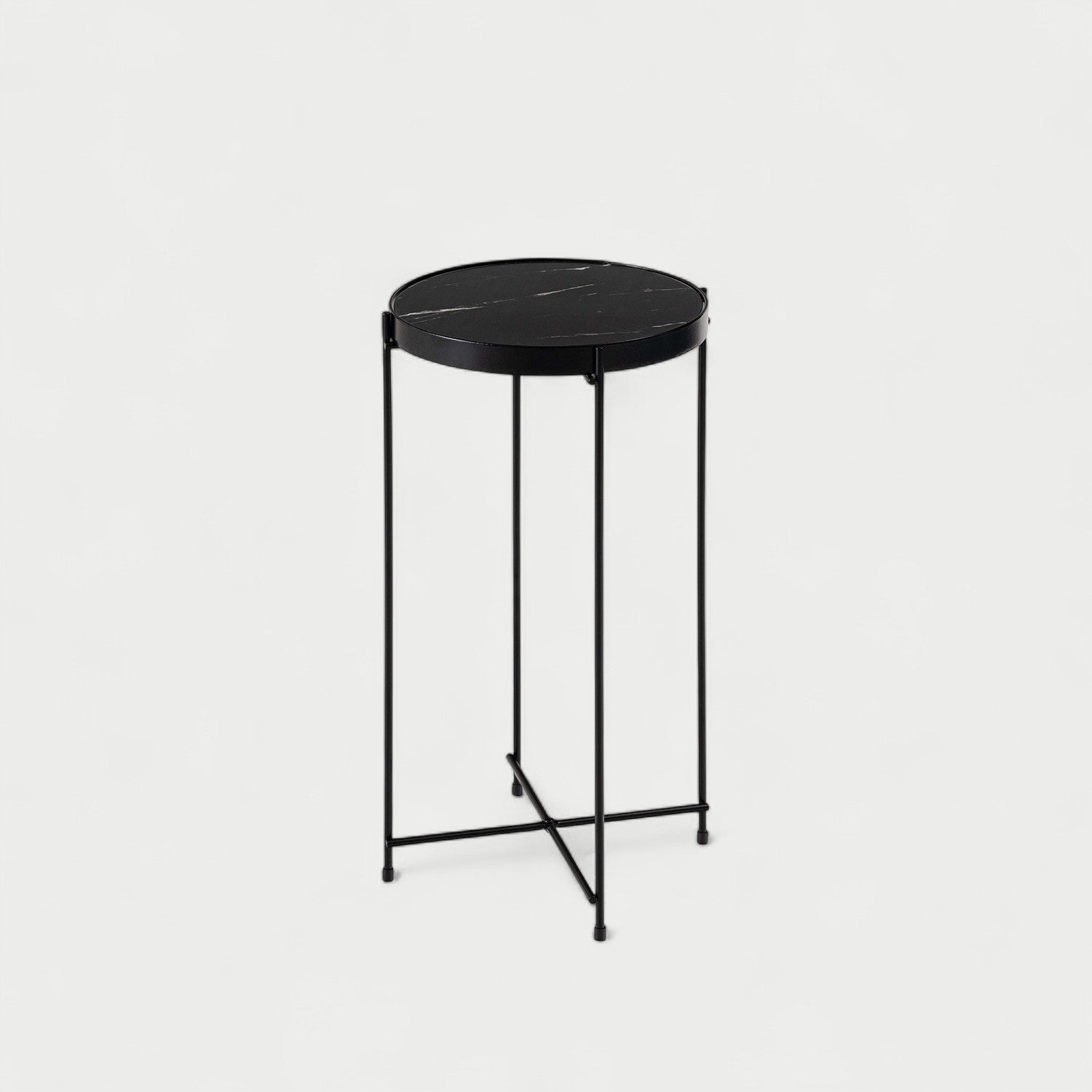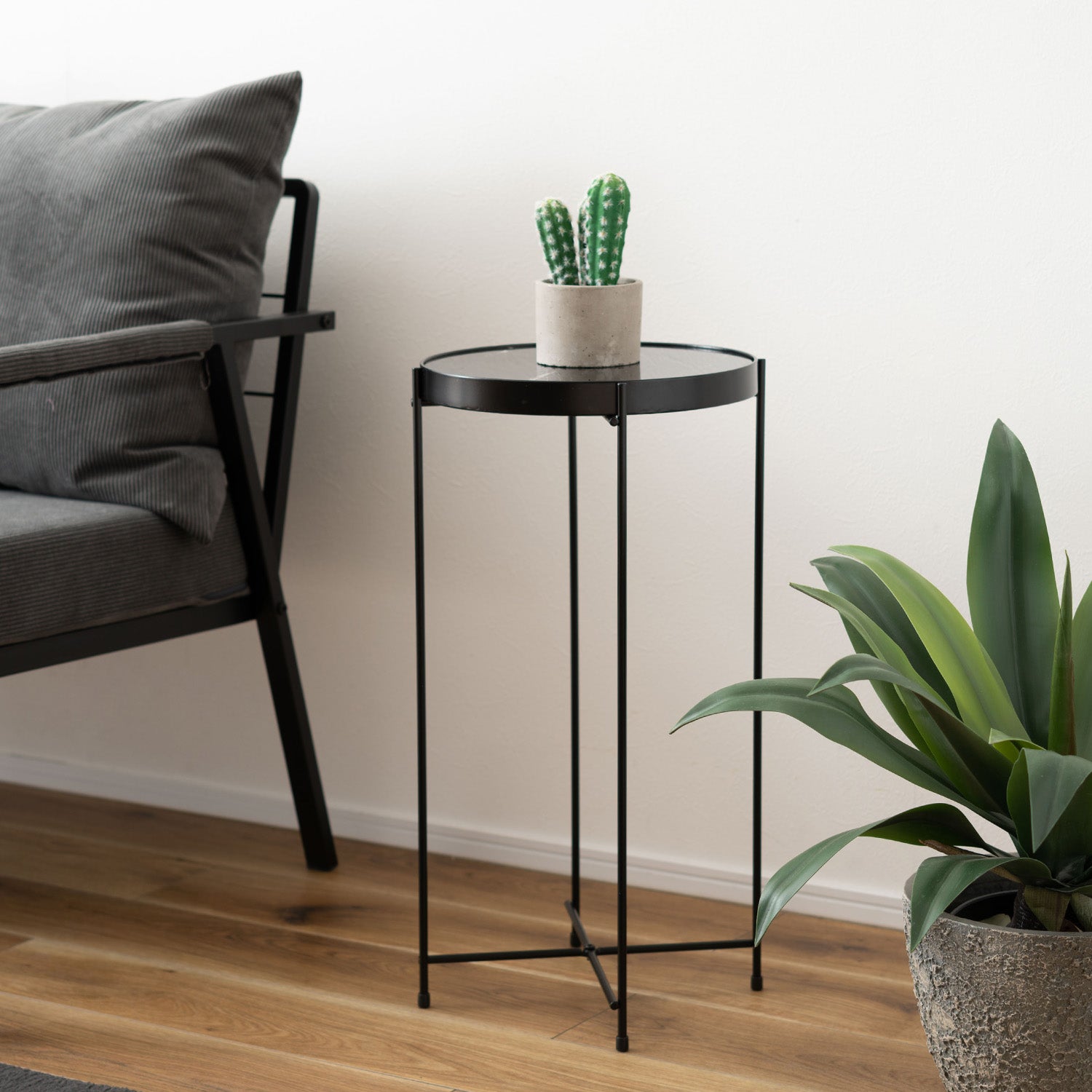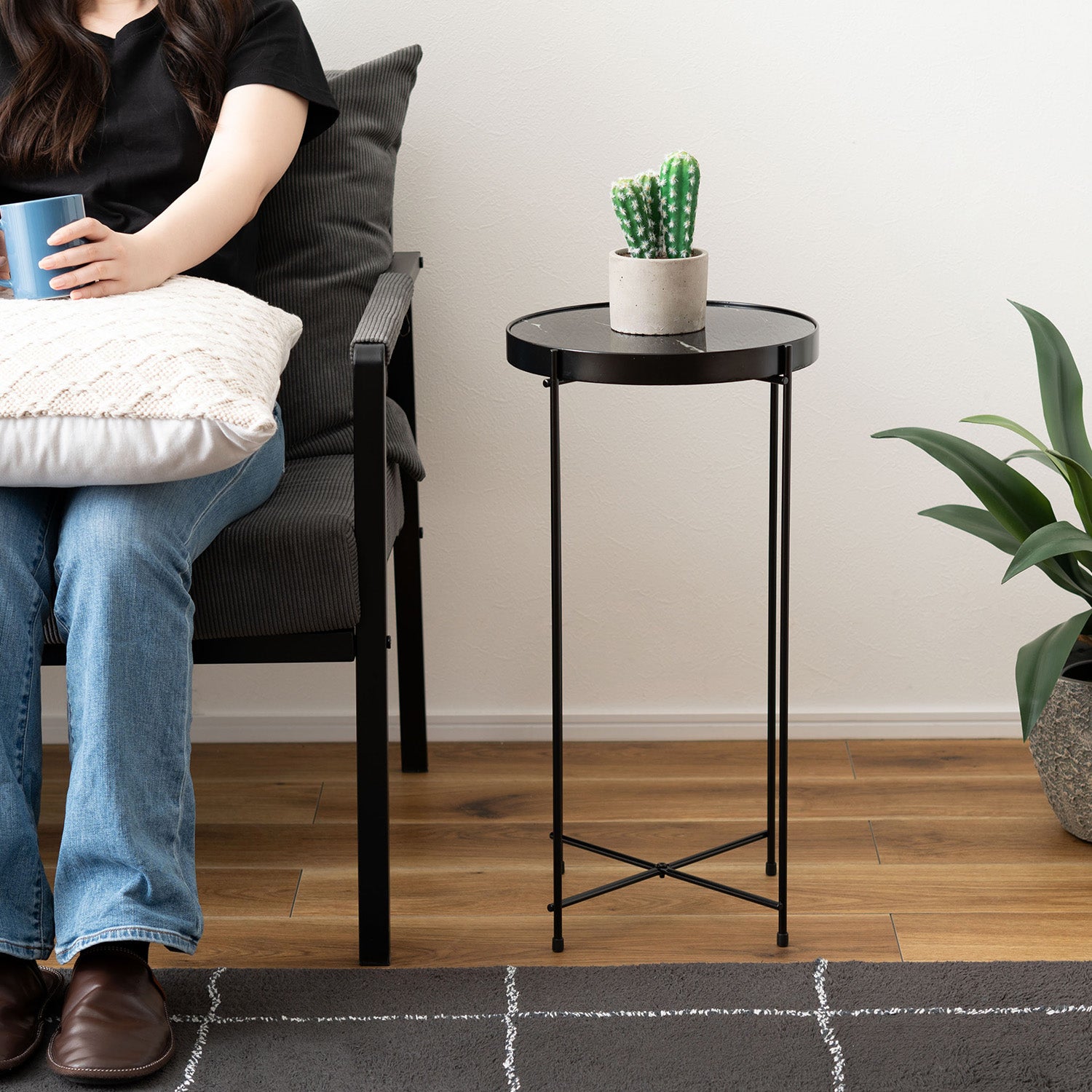 石目調 × ブラックスチールがソファ横を上質でモダンな雰囲気に。
