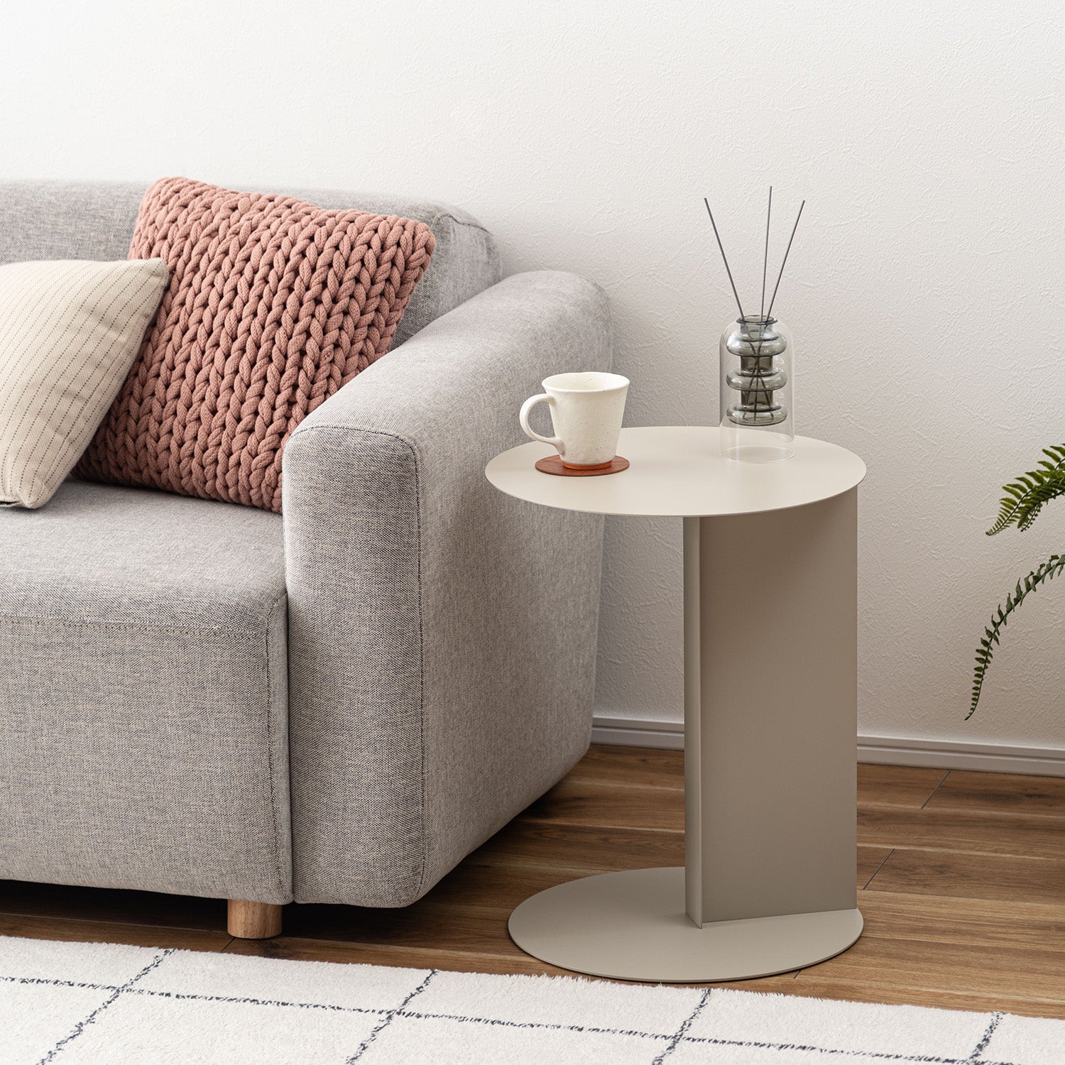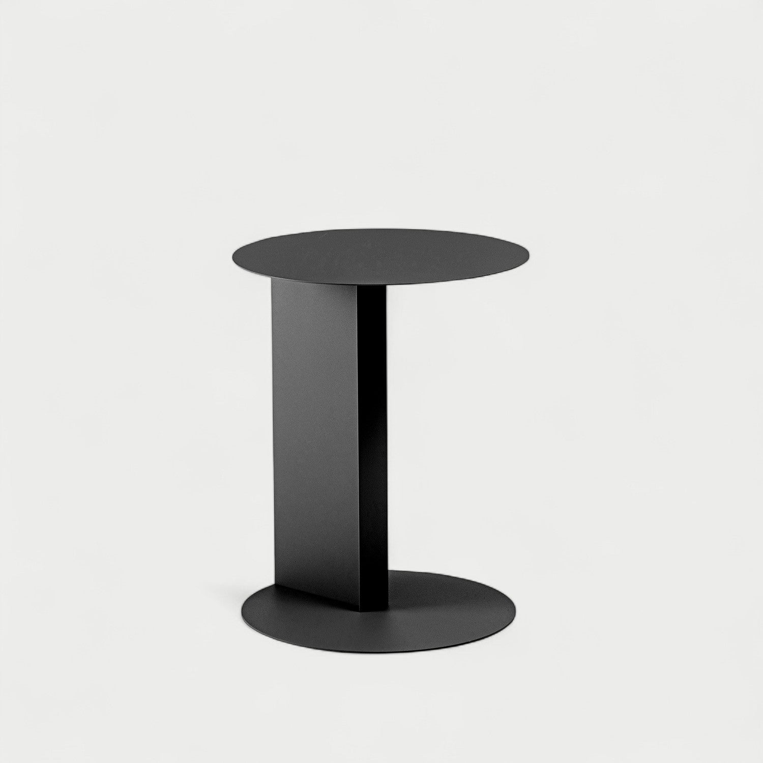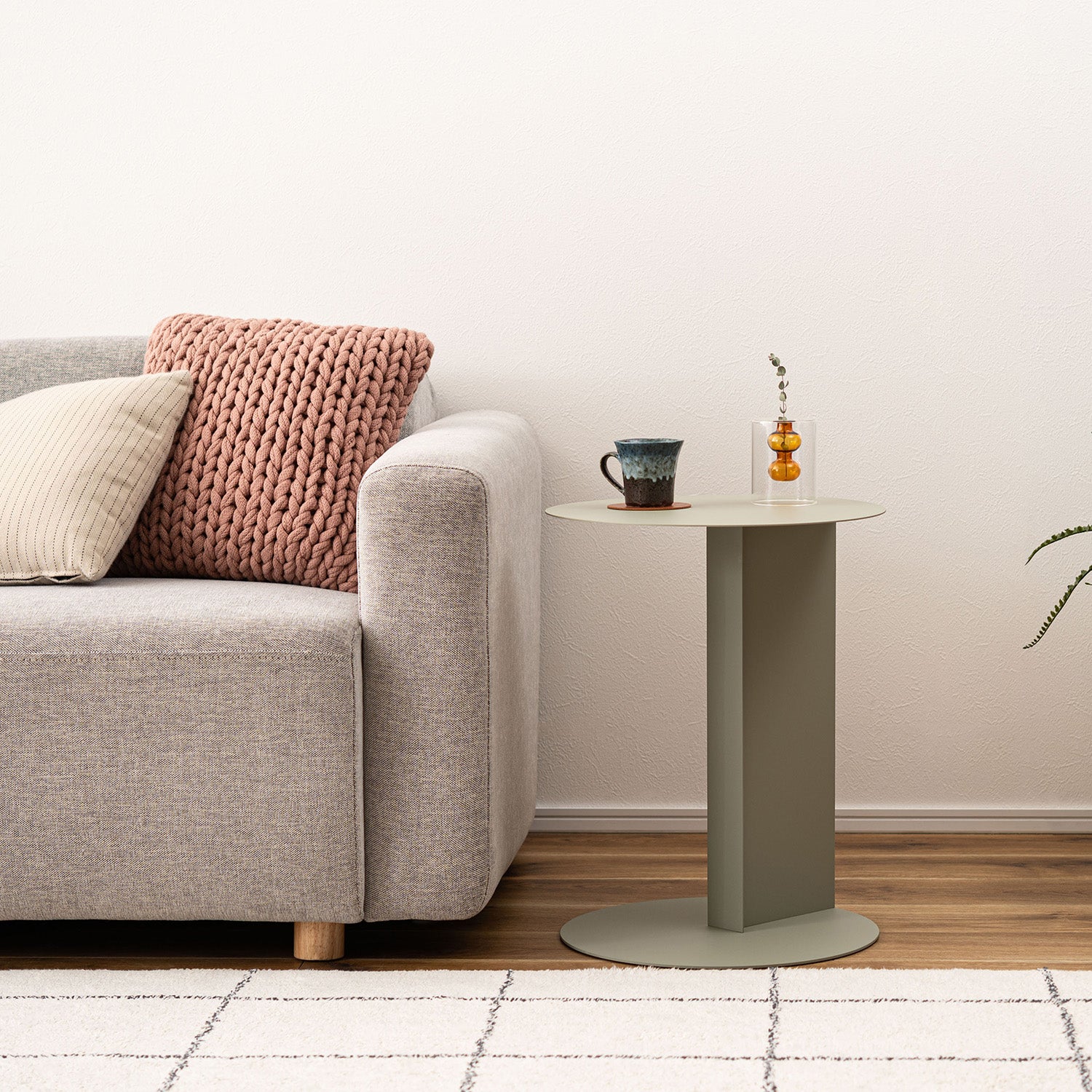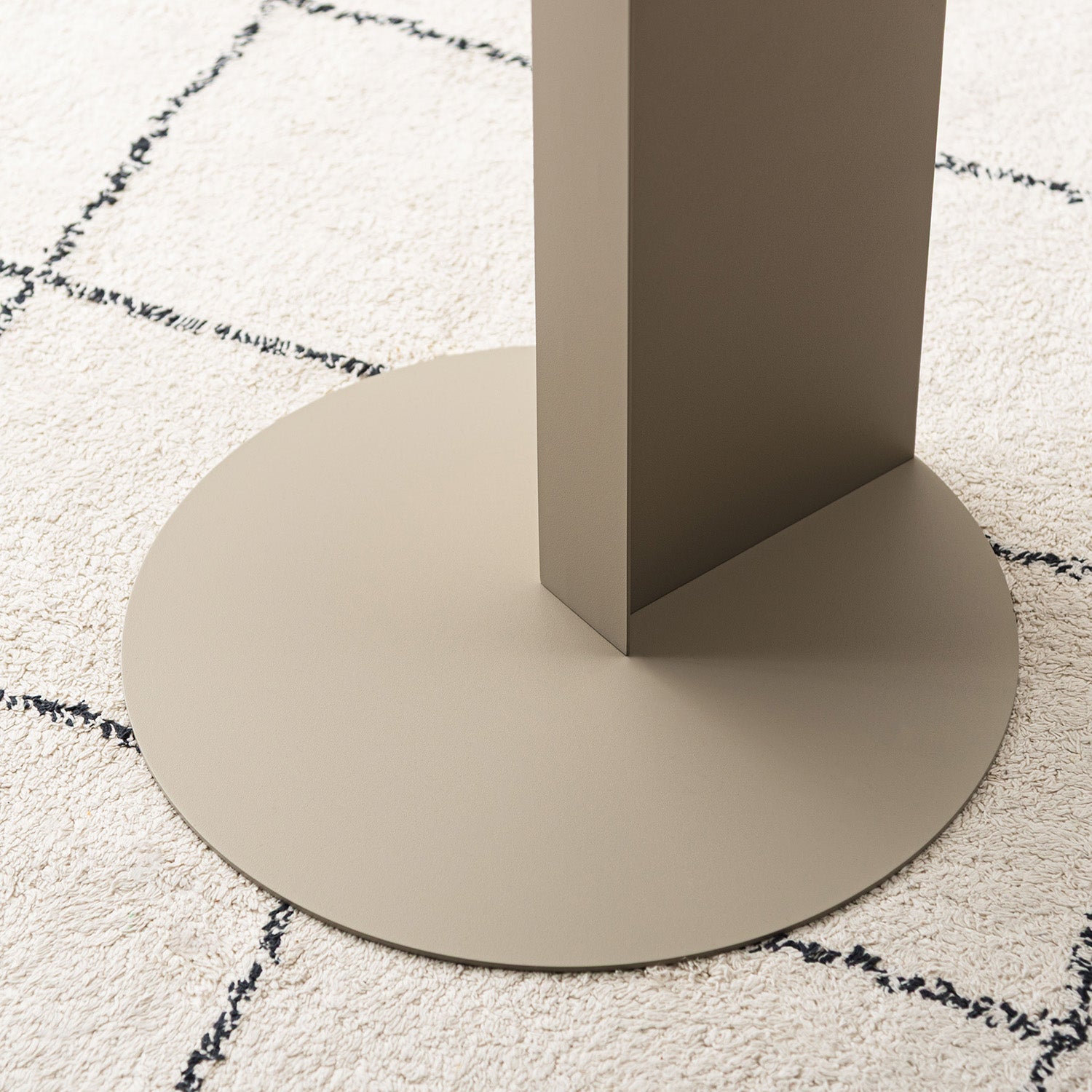 円形の天板とベースをつなぐ直線的な脚が、空間にモダンなアクセントを与えます。
