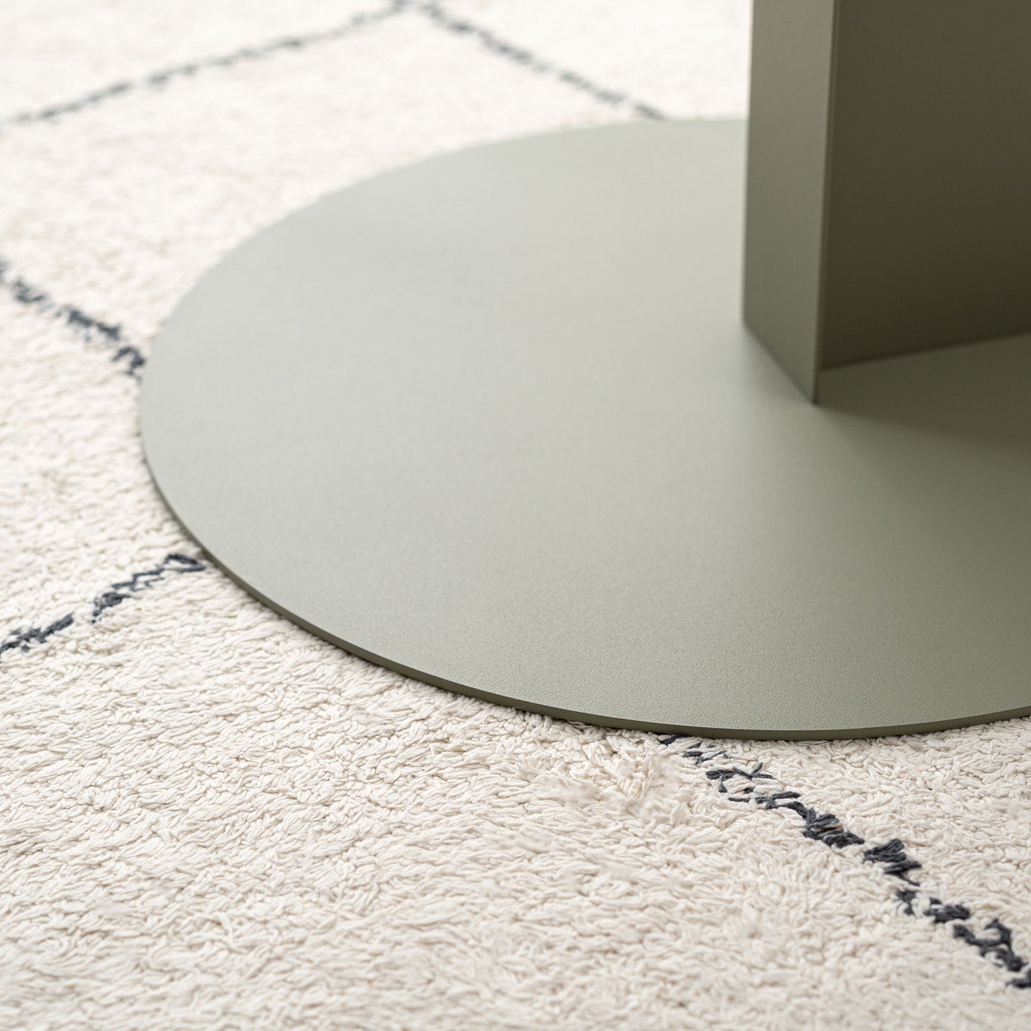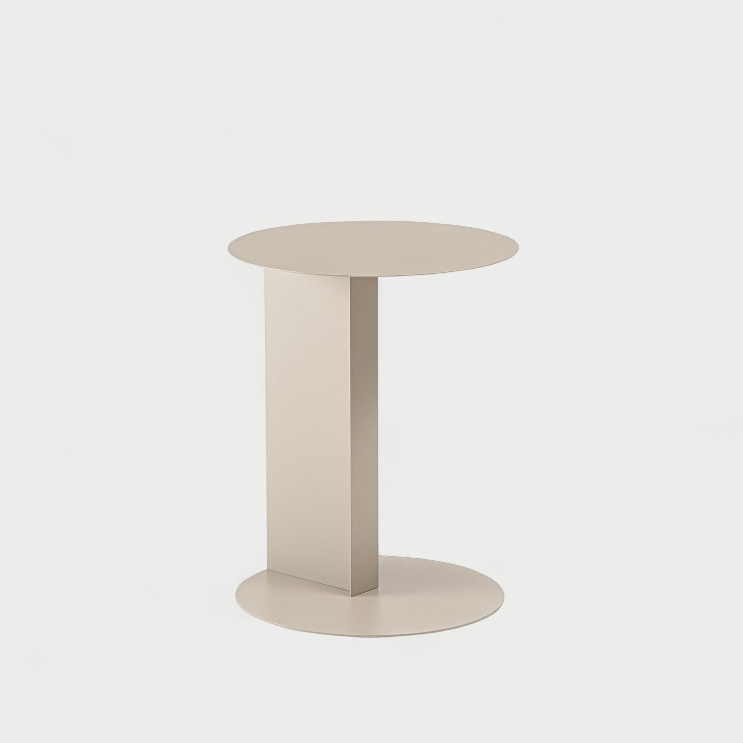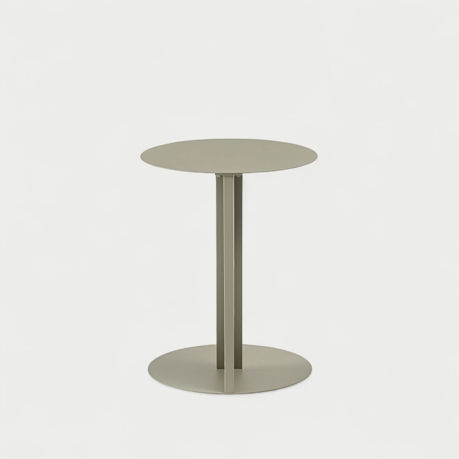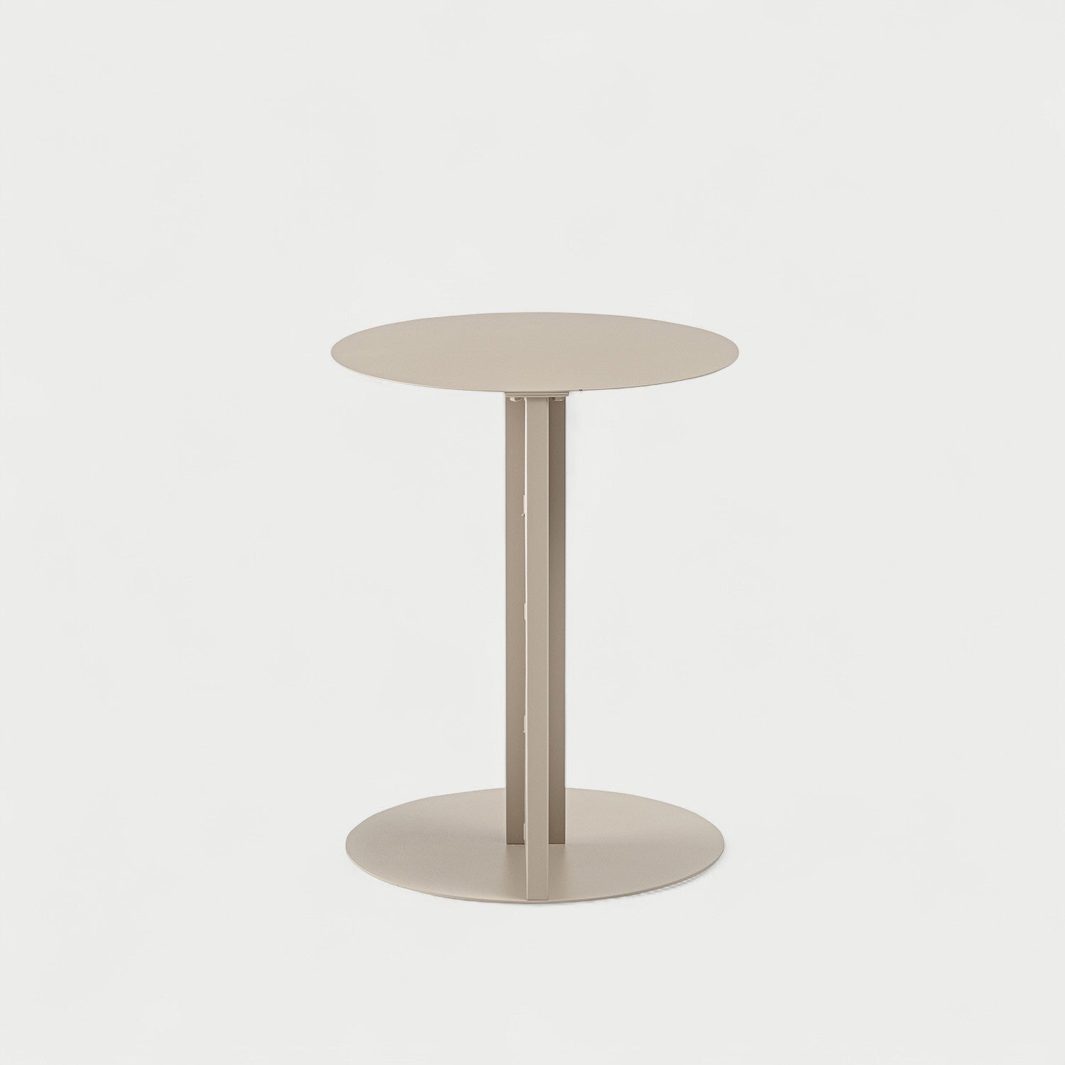円形の天板とベースをつなぐ直線的な脚が、空間にモダンなアクセントを与えます。