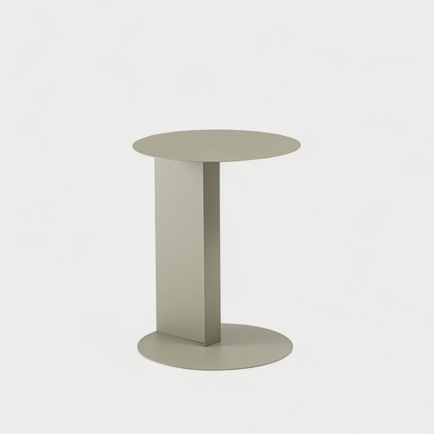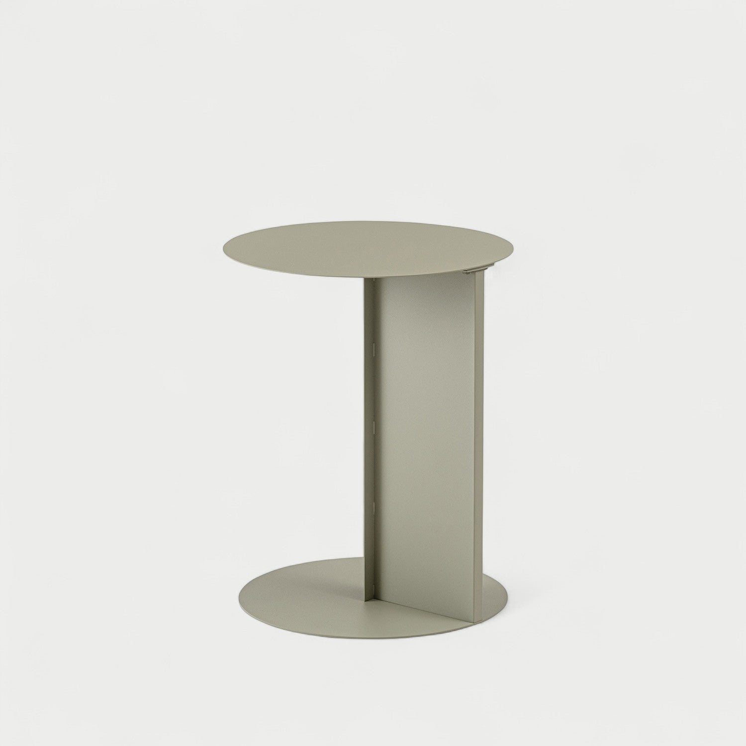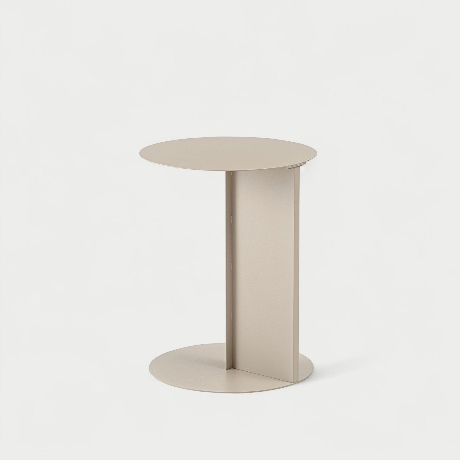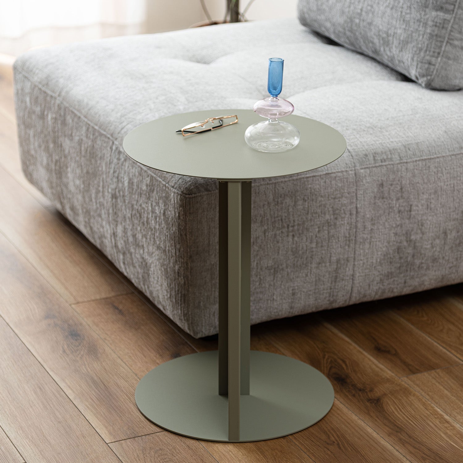円形の天板とベースをつなぐ直線的な脚が、空間にモダンなアクセントを与えます。