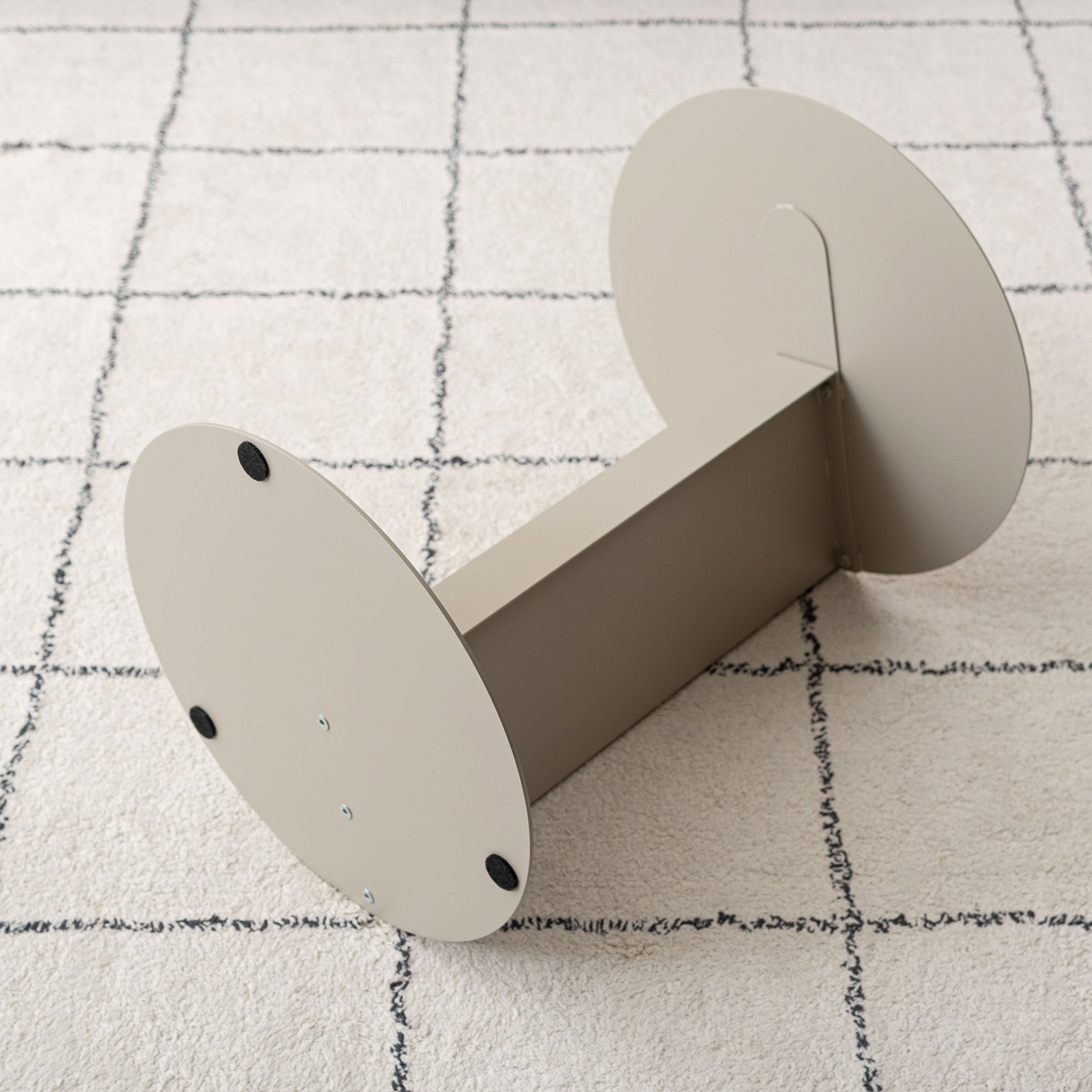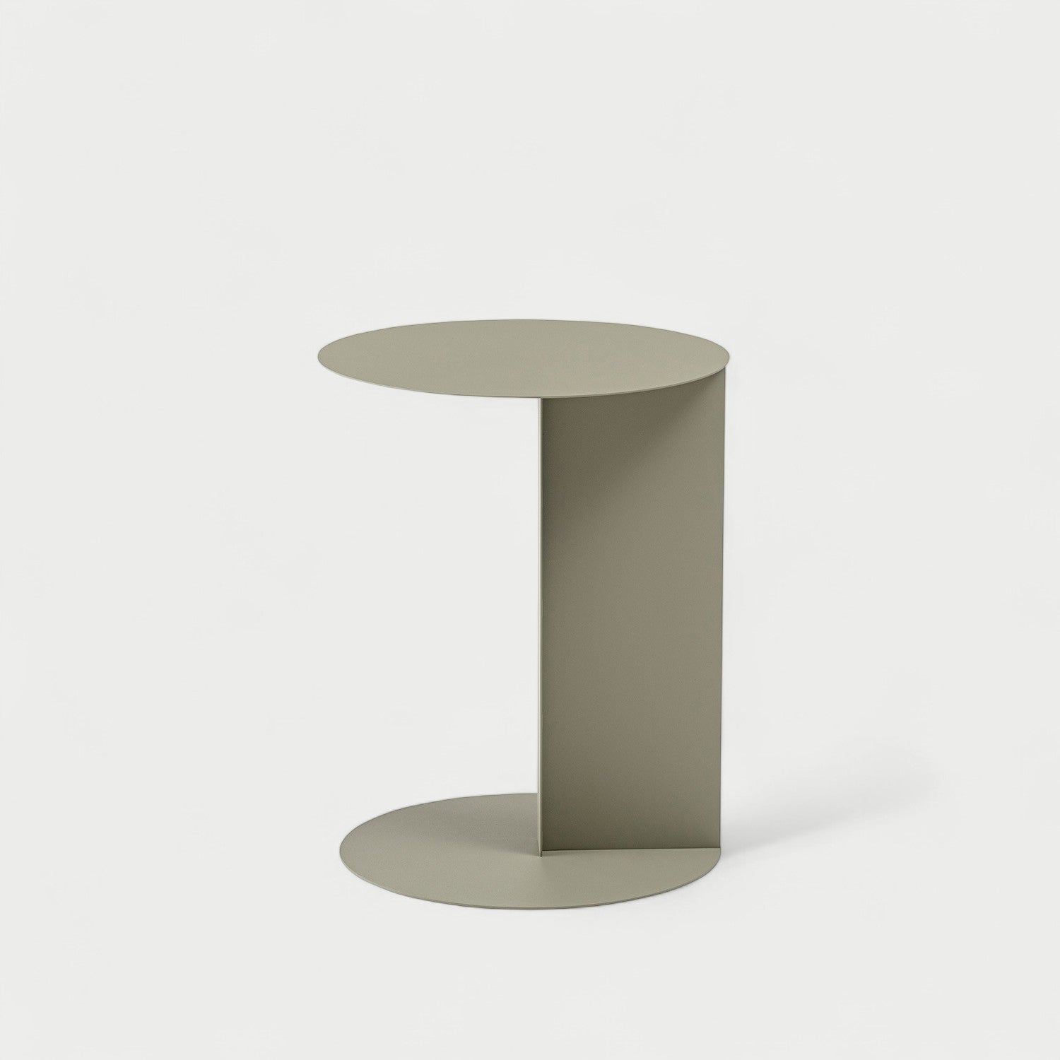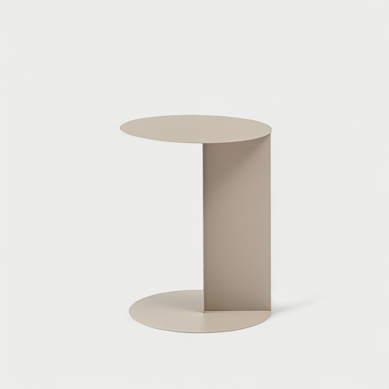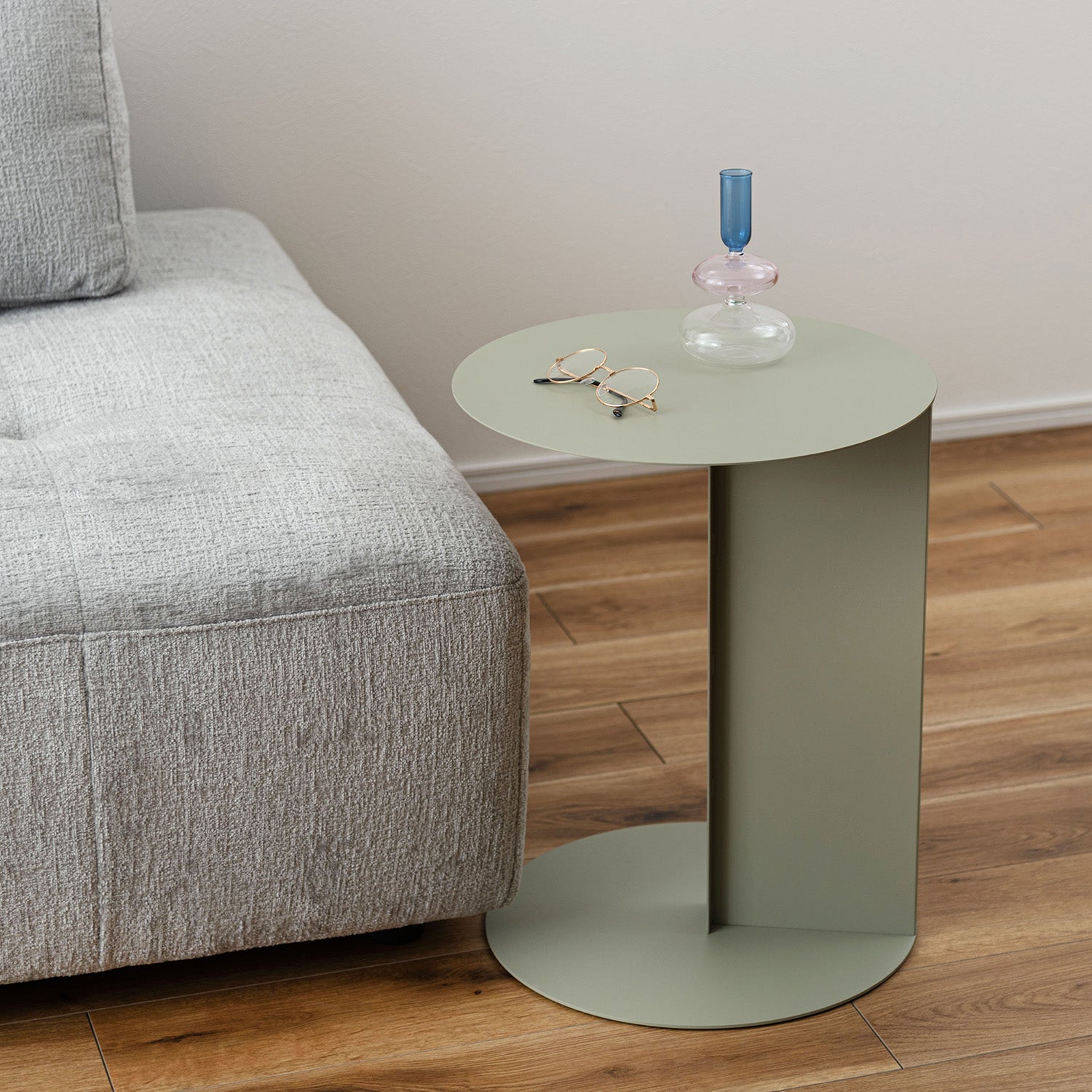 円形の天板とベースをつなぐ直線的な脚が、空間にモダンなアクセントを与えます。