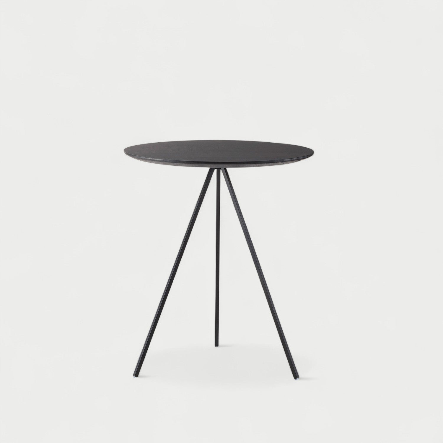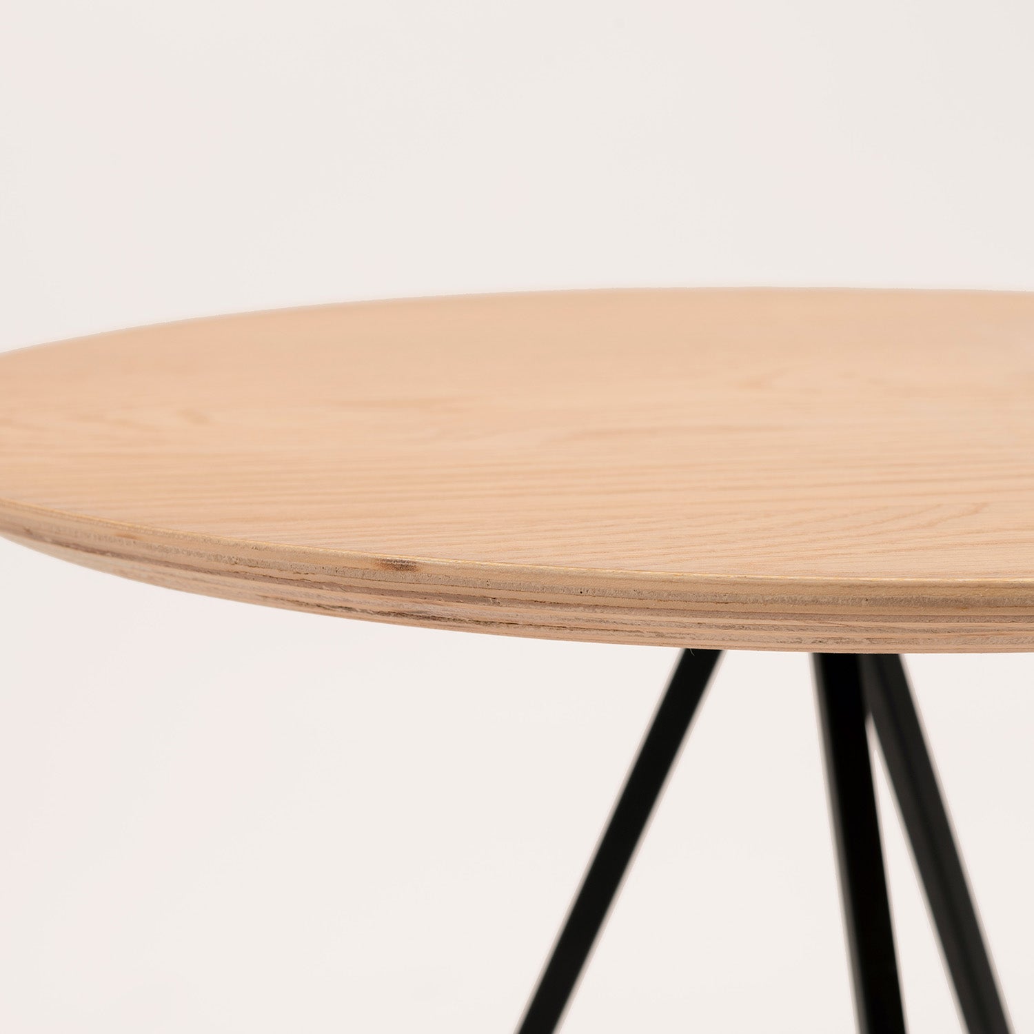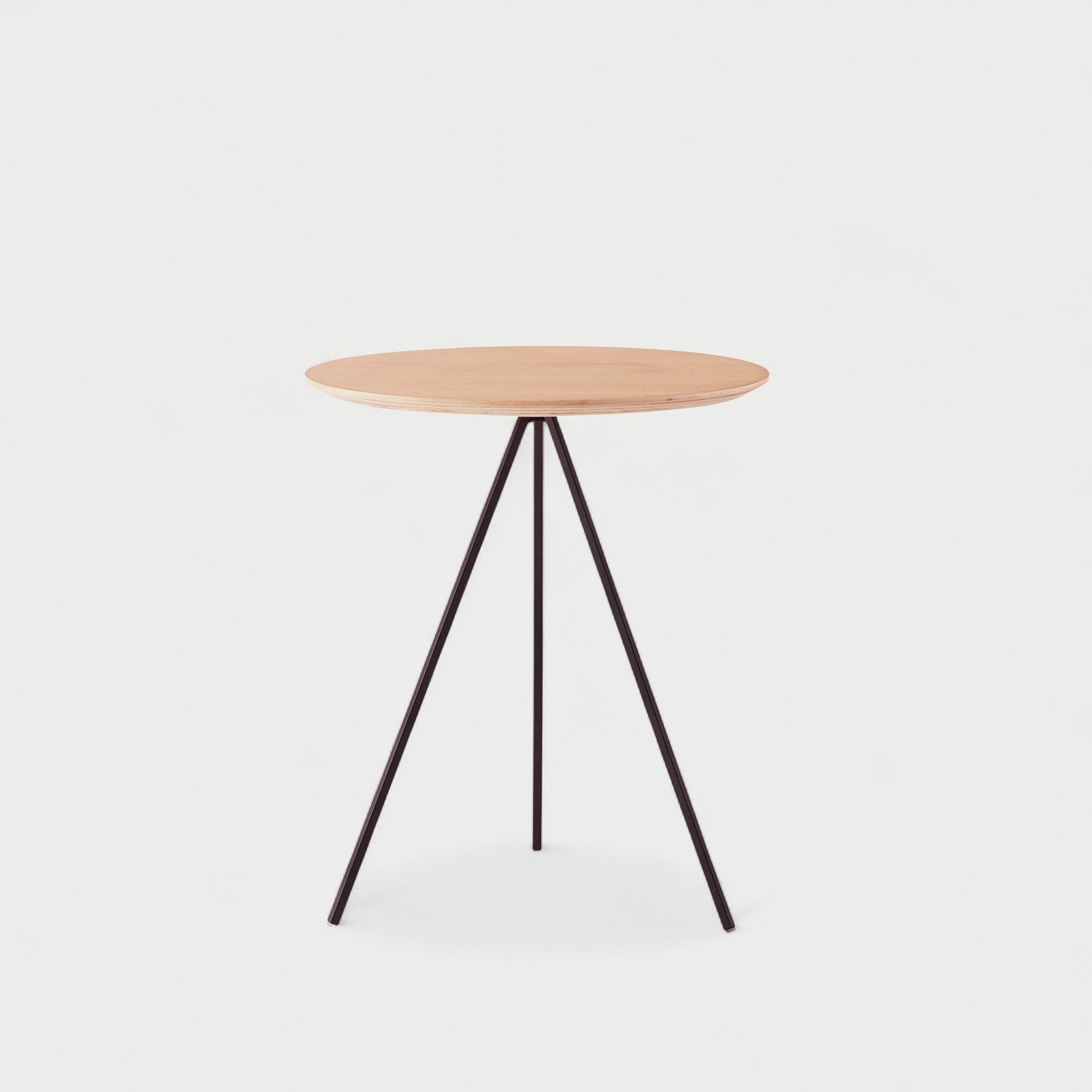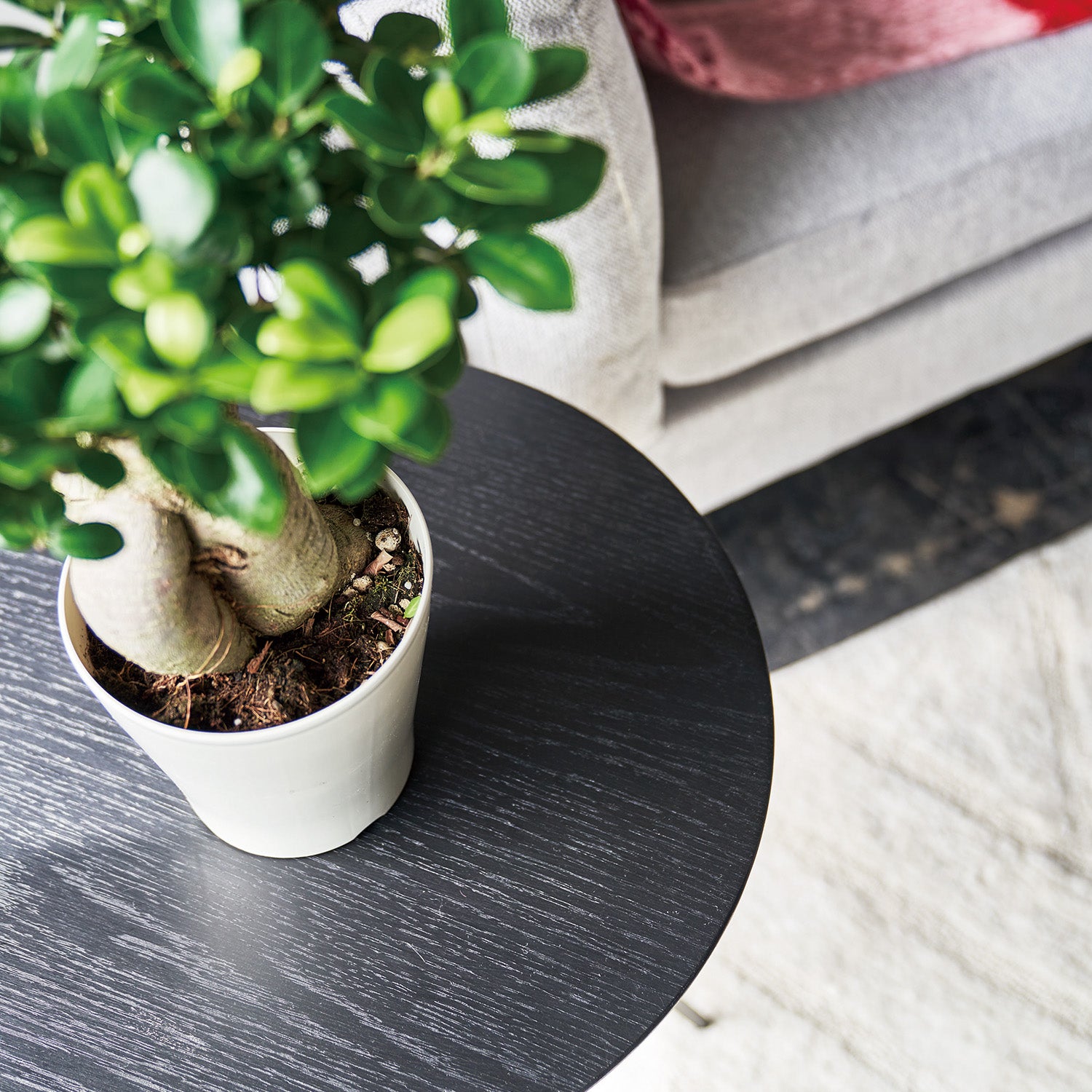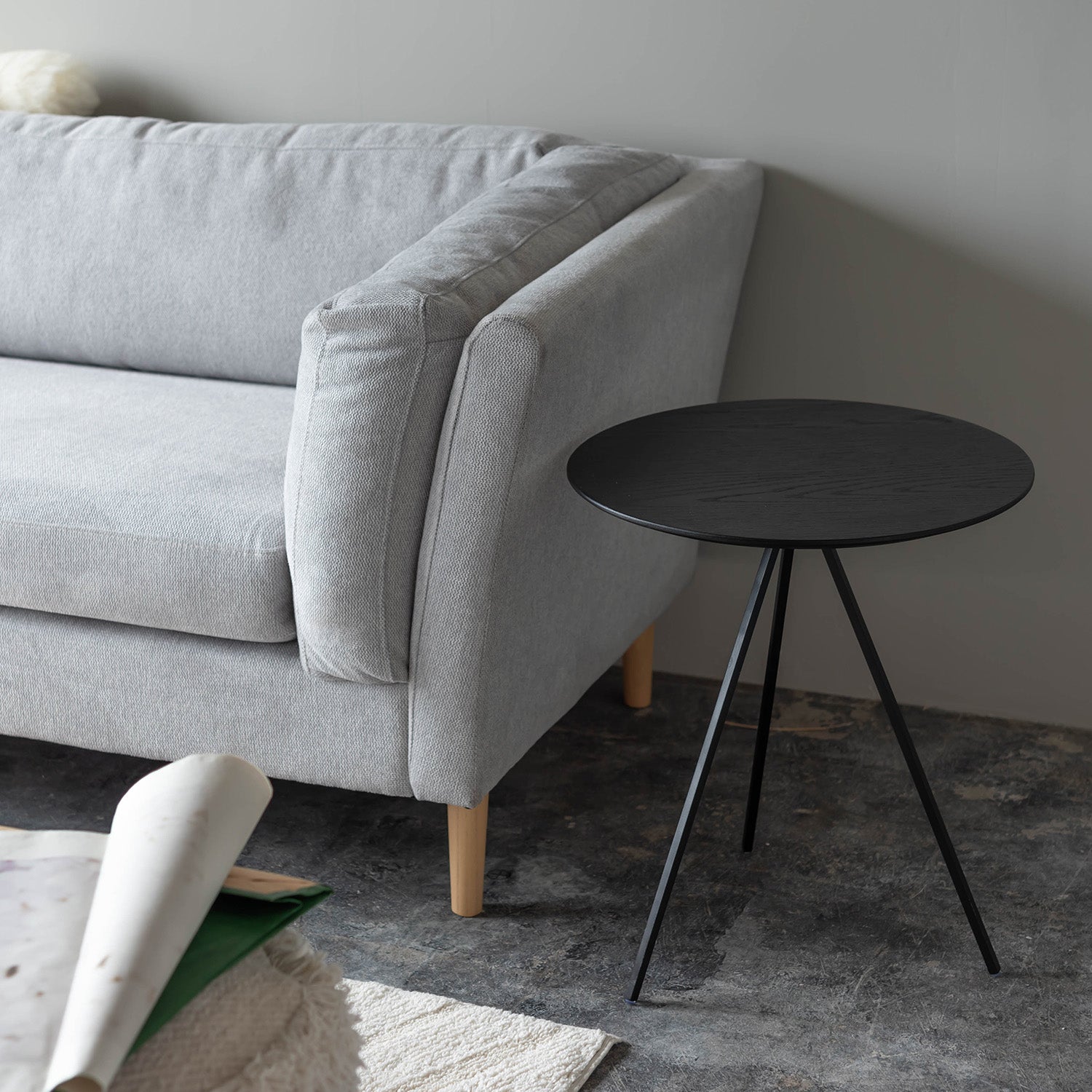 重厚感のあるオーク突板天板と、マットな質感のブラックアイアン脚を組み合わせた、上質なサイドテーブルです。